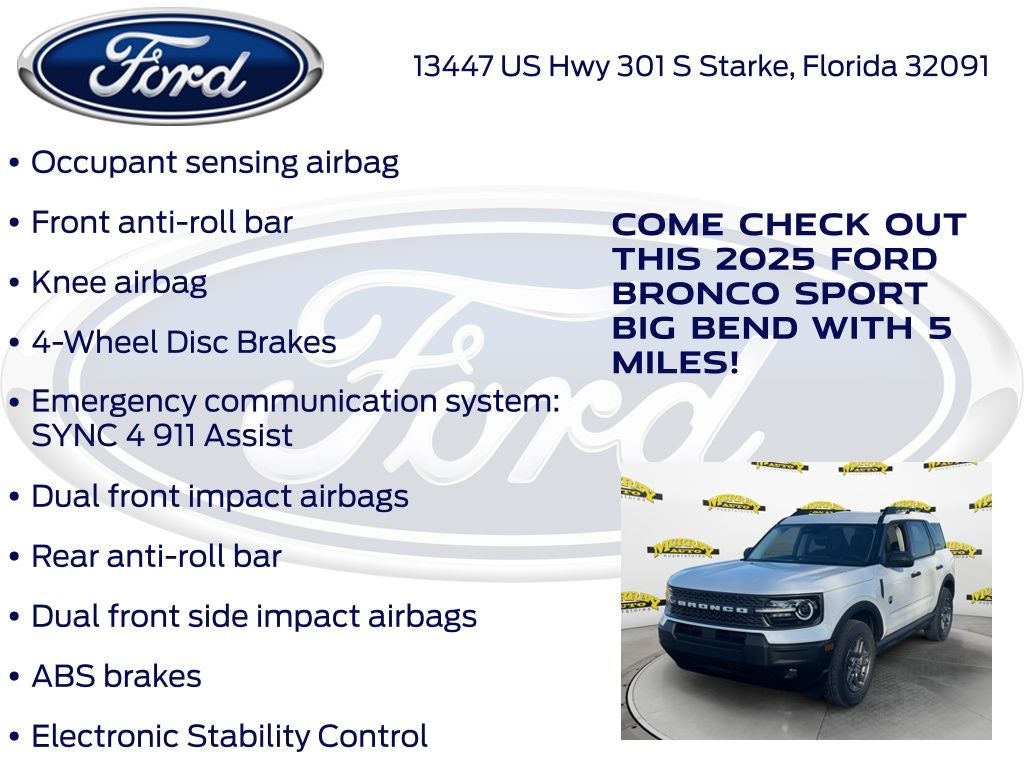 Murray Ford Superstore of Starke is proud to offer this great 2025 Ford Bronco Sport in Oxford White This vehicle is readily available and comes with the following Convenience Package (Front Driver/Passenger Seat Back Map Pockets, Heated 8-Way Power Driver's Seat, LED Fog Lamps, Premium Wrapped Steering Wheel, and Universal Garage Door Opener (UGDO)), Equipment Group 200A, Bronco Sport Big Bend 200A, 4D Sport Utility, 1.5L EcoBoost, 8-Speed Automatic, 4WD, Oxford White, Medium Light Smoked Truffle w/Cloth w/Easy-to-Clean Front Bucket Seats, 4-Wheel Disc Brakes, ABS brakes, Air Conditioning, AM/FM radio: SiriusXM, Auto High-beam Headlights, Automatic temperature control, Brake assist, Cloth w/Easy-to-Clean Front Bucket Seats, Compass, Delay-off headlights, Driver door bin, Driver vanity mirror, Dual front impact airbags, Dual front side impact airbags, Electronic Stability Control, Emergency communication system: SYNC 4 911 Assist, Four wheel independent suspension, Front anti-roll bar, Front Bucket Seats, Front Center Armrest, Front reading lights, Fully automatic headlights, Heated door mirrors, Illuminated entry, Knee airbag, Low tire pressure warning, Occupant sensing airbag, Outside temperature display, Overhead airbag, Overhead console, Panic alarm, Passenger door bin, Passenger vanity mirror, Power door mirrors, Power steering, Power windows, Pre-Collision Assist, Rear anti-roll bar, Rear Parking Sensors, Rear reading lights, Rear seat center armrest, Rear window defroster, Rear window wiper, Remote keyless entry, Security system, Speed control, Speed-sensing steering, Speed-Sensitive Wipers, Split folding rear seat, Steering wheel mounted audio controls, SYNC 4 w/Enhanced Voice Recognition, Tachometer, Telescoping steering wheel, Tilt steering wheel, Traction control, Trip computer, Variably intermittent wipers, Wheels: 17 Carbonized Gray-Painted Aluminum, 6 Speakers, AM/FM Stereo, Radio data system, and SiriusXM;