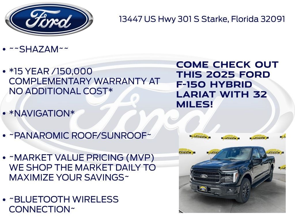 Murray Ford Superstore of Starke is very proud to offer this trusty 2025 Ford F-150 in Agate Black Metallic This vehicle is readily available and comes with the following Equipment Group 502A High (2nd Row Heated Seats, Ambient Lighting - Ice Blue Color Only, Heads-Up Display, Illuminated Driver & Passenger Visors, Power-Sliding Rear Window, and Radio: B&O Unleashed Sound System by Bang & Olufsen), FX4 Off-Road Package (4x4 FX4 Off-Road Bodyside Decal, Hill Descent Control, Monotube Rear Shocks, Off-Road Tuned Front Shock Absorbers, Rock Crawl Mode, and Tray Style Floor Liner w/o Carpet Mats), GVWR: 7,400 lbs Payload Package, Lariat Black Appearance Package (Black Exterior Badging, Black Grille, Black Taillamp Bezels, Body-Color Front & Rear Bumpers, Body-Color Skull Caps & Door Handles, Dark Interior Appliques, Gray Box Side Decal, and Matte Black Tailgate F-150 Decal), Mobile Office Package (Console Worksurface, Partitioned Lockable Rear Storage, and Wireless Charging), F-150 Lariat 502A, 4D SuperCrew, 3.5L PowerBoost Full-Hybrid V6, 10-Speed Automatic, 4WD, Agate Black Metallic, Black w/ActiveX Trimmed Bucket Seats, 4-Wheel Disc Brakes, ABS brakes, ActiveX Trimmed Bucket Seats, Adjustable pedals, AM/FM radio: SiriusXM with 360L, Auto High-beam Headlights, Auto-dimming door mirrors, Auto-dimming Rear-View mirror, Automatic temperature control, BlueCruise Equipped (1-Year Plan), Brake assist, Compass, Delay-off headlights, Driver door bin, Driver vanity mirror, Dual front impact airbags, Dual front side impact airbags, Electronic Locking w/3.73 Axle Ratio, Electronic Stability Control, Emergency communication system: SYNC 4 911 Assist, Front anti-roll bar, Front Bucket Seats, Front Center Armrest, Front dual zone A/C, Front fog lights, Front reading lights, Front wheel independent suspension, Fully automatic headlights, Garage door transmitter, Heated door mirrors, Heated front seats, Heated steering wheel, Illuminated entry, Low tire pressure warning, Memory seat, Navigation system: Connected Navigation, Occupant sensing airbag, Outside temperature display, Overhead airbag, Overhead console, Panic alarm, Passenger door bin, Passenger vanity mirror, Pedal memory, Power door mirrors, Power driver seat, Power passenger seat, Power steering, Power windows, Rain sensing wipers, Rear reading lights, Rear seat center armrest, Rear step bumper, Rear window defroster, Remote keyless entry, Security system, Speed control, Split folding rear seat, Steering wheel mounted audio controls, SYNC 4 w/Enhanced Voice Recognition, Tachometer, Telescoping steering wheel, Tilt steering wheel, Tough Bed Spray-In Bedliner, Traction control, Trip computer, Turn signal indicator mirrors, Variably intermittent wipers, Ventilated front seats, Voltmeter, Wheels: 20 Gloss Black Painted Aluminum, 8 Speakers, Air Conditioning, Radio data system, and Radio: B&O Sound System by Bang & Olufsen;