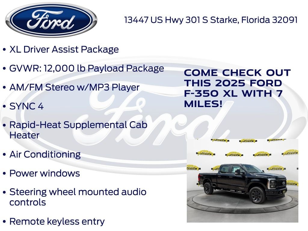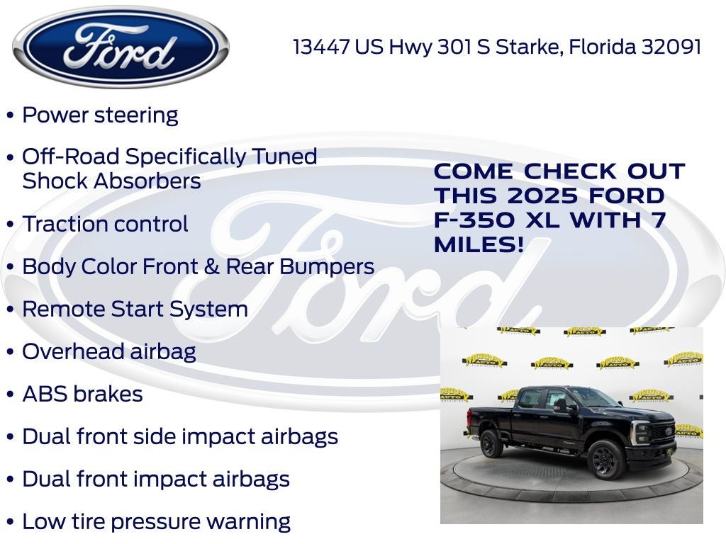 Murray Ford Superstore of Starke is excited to offer this reliable 2025 Ford F-350SD in Agate Black Metallic This vehicle is readily available and comes with the following 360-Degree Camera Package (360-Degree Camera, LED Center High-Mounted Stop Lamp (CHMSL) Camera, and Rear Parking Sensors), FX4 Off-Road Package (Hill Descent Control, Off-Road Specifically Tuned Shock Absorbers, and Unique FX4 Off-Road Box Decal), Order Code 610A (SYNC 4), STX Appearance Package (Automatic High Beam, Body-Color Front Bumper, Body-Color Rear Bumper, Cloth 40/20/40 Split Bench Seat, LED Box Lighting, LED Fog Lamps, Painted Grille, and Pre-Collision Assist), XL Driver Assist Package, F-350 SuperDuty XL 610A, 4D Crew Cab, Power Stroke 6.7L V8 DI 32V OHV Turbodiesel, 10-Speed Automatic, 4WD, Agate Black Metallic, Medium Dark Slate w/Cloth 40/20/40 Split Bench Seat, 120V/400W Outlet, 34 Gallon Fuel Tank, 4-Wheel Disc Brakes, 410 Amp Dual Alternators, ABS brakes, Air Conditioning, Brake assist, Compass, Delay-off headlights, Dual front impact airbags, Dual front side impact airbags, Electronic Stability Control, Emergency communication system: SYNC 4 911 Assist, Engine Block Heater, Exterior Parking Camera Rear, Front anti-roll bar, Front reading lights, Fully automatic headlights, Heated door mirrors, Illuminated entry, LED Roof Clearance Lights, Low tire pressure warning, Outside temperature display, Overhead airbag, Overhead console, Panic alarm, Passenger vanity mirror, Platform Running Boards, Power door mirrors, Power steering, Power windows, Rapid-Heat Supplemental Cab Heater, Rear reading lights, Rear step bumper, Remote keyless entry, Remote Start System, Security system, Speed control, Split folding rear seat, Steering wheel mounted audio controls, Tachometer, Telescoping steering wheel, Tilt steering wheel, Traction control, Trip computer, Turn signal indicator mirrors, Upfitter Switches (6), Variably intermittent wipers, and Wheels: 20 Dark Carbonized Gray Painted Aluminum;