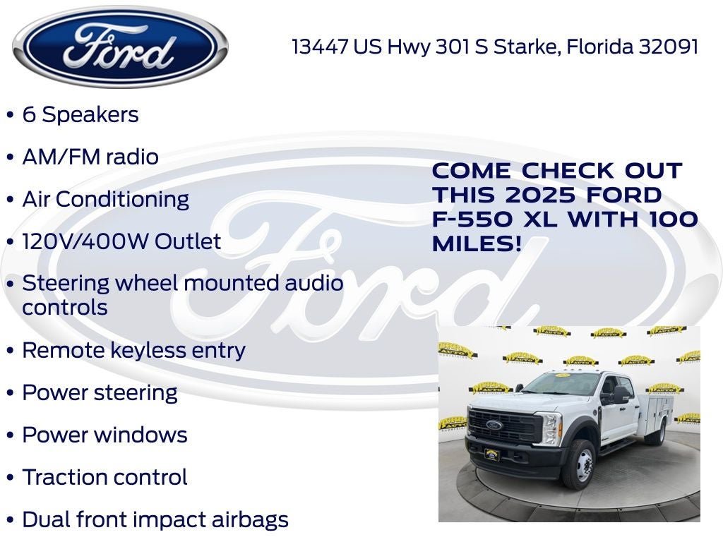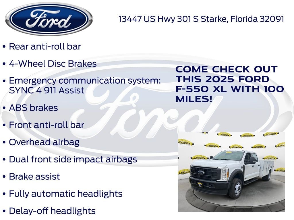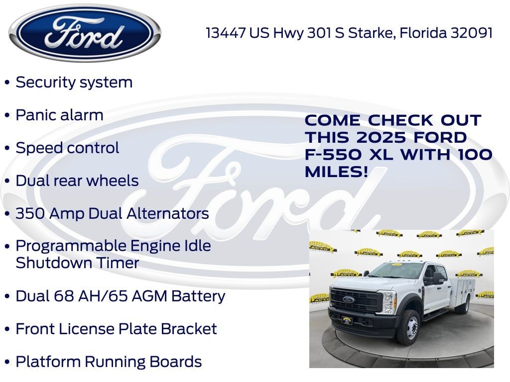 Murray Ford Superstore of Starke is pleased to offer this hard-working 2025 Ford F-550SD in Oxford White This vehicle is readily available and comes with the following GVWR: 18,000 lbs Payload Package, Order Code 660A, F-550 SuperDuty XL DRW 660A, 4D Crew Cab/Chassis, Power Stroke 6.7L V8 DI 32V OHV Turbodiesel, 10-Speed Automatic, 4WD, Oxford White, Medium Dark Slate w/HD Vinyl 40/20/40 Split Bench Seat, 120V/400W Outlet, 350 Amp Dual Alternators, 4-Wheel Disc Brakes, 6 Speakers, ABS brakes, Air Conditioning, AM/FM radio, Brake assist, Center High-Mounted Stop Lamp (CHMSL), Compass, Delay-off headlights, Dual 68 AH/65 AGM Battery, Dual front impact airbags, Dual front side impact airbags, Dual rear wheels, Emergency communication system: SYNC 4 911 Assist, Front anti-roll bar, Front Center Armrest w/Storage, Front License Plate Bracket, Front reading lights, Fully automatic headlights, HD Vinyl 40/20/40 Split Bench Seat, Heated door mirrors, Illuminated entry, Limited Slip w/4.10 Axle Ratio, Outside temperature display, Overhead airbag, Overhead console, Panic alarm, Passenger vanity mirror, Platform Running Boards, Power door mirrors, Power steering, Power windows, Programmable Engine Idle Shutdown Timer, Rear anti-roll bar, Rear reading lights, Rear View Camera & Prep Kit, Remote keyless entry, Security system, Speed control, Split folding rear seat, Steering wheel mounted audio controls, SYNC 4 Communication & Entertainment System, Tachometer, Telescoping steering wheel, Tilt steering wheel, Traction control, Trailer Brake Controller, Trip computer, Turn signal indicator mirrors, Variably intermittent wipers, and Wheels: 19.5 x 6 Argent Painted Steel;