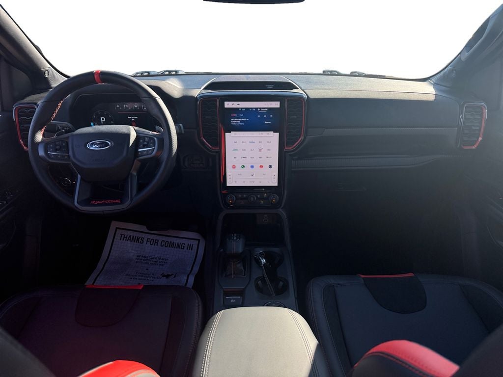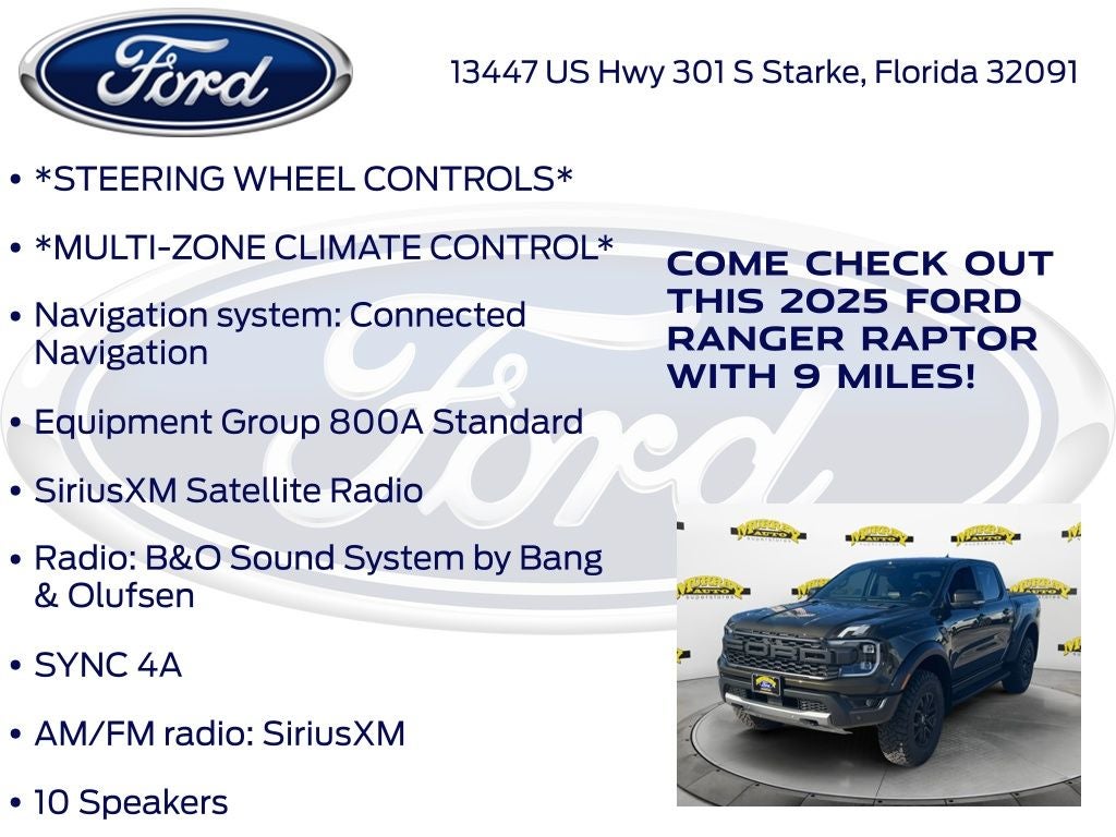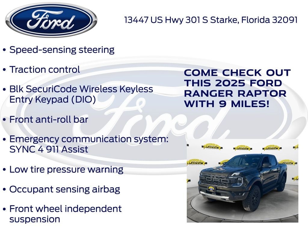 Murray Ford Superstore of Starke is pumped up to offer this hardy, reliable 2025 Ford Ranger in Shelter Green Metallic This vehicle is readily available and comes with the following Equipment Group 800A Standard, Ranger Raptor 800A, 4D Crew Cab, 3.0L EcoBoost V6, 10-Speed Automatic, 4WD, Shelter Green Metallic, Ebony w/Leather-Trimmed Front Heated Bucket Seats, 10 Speakers, 4-Wheel Disc Brakes, 4.27 Axle Ratio, ABS brakes, Air Conditioning, AM/FM radio: SiriusXM, Auto High-beam Headlights, Auto-dimming Rear-View mirror, Automatic temperature control, Blk SecuriCode Wireless Keyless Entry Keypad (DIO), Brake assist, Compass, Delay-off headlights, Driver door bin, Driver vanity mirror, Dual front impact airbags, Dual front side impact airbags, Electronic Stability Control, Emergency communication system: SYNC 4 911 Assist, Front & Rear Splash Guards/Mud Flaps, Front anti-roll bar, Front Bucket Seats, Front Center Armrest, Front dual zone A/C, Front fog lights, Front reading lights, Front wheel independent suspension, Fully automatic headlights, Garage door transmitter, Heated door mirrors, Heated front seats, Heated steering wheel, Illuminated entry, Leather Shift Knob, Leather steering wheel, Leather-Trimmed Front Heated Bucket Seats, Low tire pressure warning, Memory seat, Navigation system: Connected Navigation, Occupant sensing airbag, Outside temperature display, Overhead airbag, Overhead console, Panic alarm, Passenger door bin, Passenger vanity mirror, Power door mirrors, Power driver seat, Power passenger seat, Power steering, Power windows, Radio: B&O Sound System by Bang & Olufsen, Rain sensing wipers, Raptor Exterior Graphics, Rear reading lights, Rear seat center armrest, Rear step bumper, Rear window defroster, Remote keyless entry, Security system, SiriusXM Satellite Radio, Speed control, Speed-sensing steering, Steering wheel mounted audio controls, SYNC 4A, Telescoping steering wheel, Tilt steering wheel, Tough Bed Spray-In Bedliner, Traction control, Trip computer, Turn signal indicator mirrors, Variably intermittent wipers, Voltmeter, and Wheels: 17 Gray-Painted Aluminum;