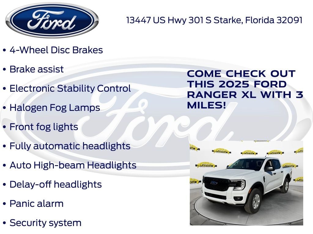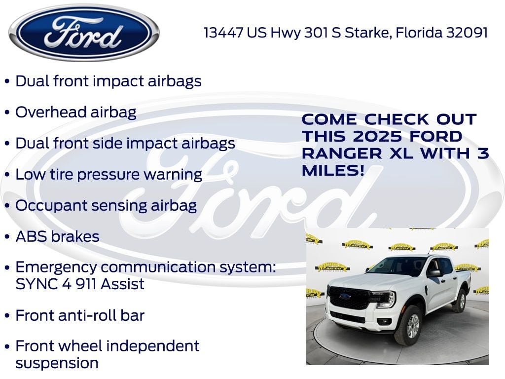 Murray Ford Superstore of Starke is very proud to offer this hardy, reliable 2025 Ford Ranger in Oxford White This vehicle is readily available and comes with the following Equipment Group 100A Standard, STX Appearance Package (Halogen Fog Lamps, LED Reflector Headlamps, and STX Fender Badge), Ranger XL 100A, 4D Crew Cab, EcoBoost 2.3L I4 GTDi DOHC Turbocharged VCT, 10-Speed Automatic, RWD, Oxford White, Ebony w/Cloth Front Bucket Seats, 3.73 Axle Ratio, 4-Wheel Disc Brakes, ABS brakes, Air Conditioning, AM/FM Stereo, Auto High-beam Headlights, Brake assist, Bumpers: body-color, Cloth Front Bucket Seats, Compass, Delay-off headlights, Driver door bin, Dual front impact airbags, Dual front side impact airbags, Electronic Stability Control, Emergency communication system: SYNC 4 911 Assist, Front anti-roll bar, Front Bucket Seats, Front Center Armrest, Front fog lights, Front reading lights, Front wheel independent suspension, Fully automatic headlights, Illuminated entry, Low tire pressure warning, Occupant sensing airbag, Outside temperature display, Overhead airbag, Overhead console, Panic alarm, Passenger door bin, Power door mirrors, Power steering, Power windows, Rear reading lights, Rear seat center armrest, Rear step bumper, Remote keyless entry, Security system, Speed control, Speed-sensing steering, Steering wheel mounted audio controls, SYNC 4A, Telescoping steering wheel, Tilt steering wheel, Traction control, Trip computer, Variably intermittent wipers, Voltmeter, Wheels: 17 Silver-Painted Aluminum, 6 Speakers, and AM/FM radio;
