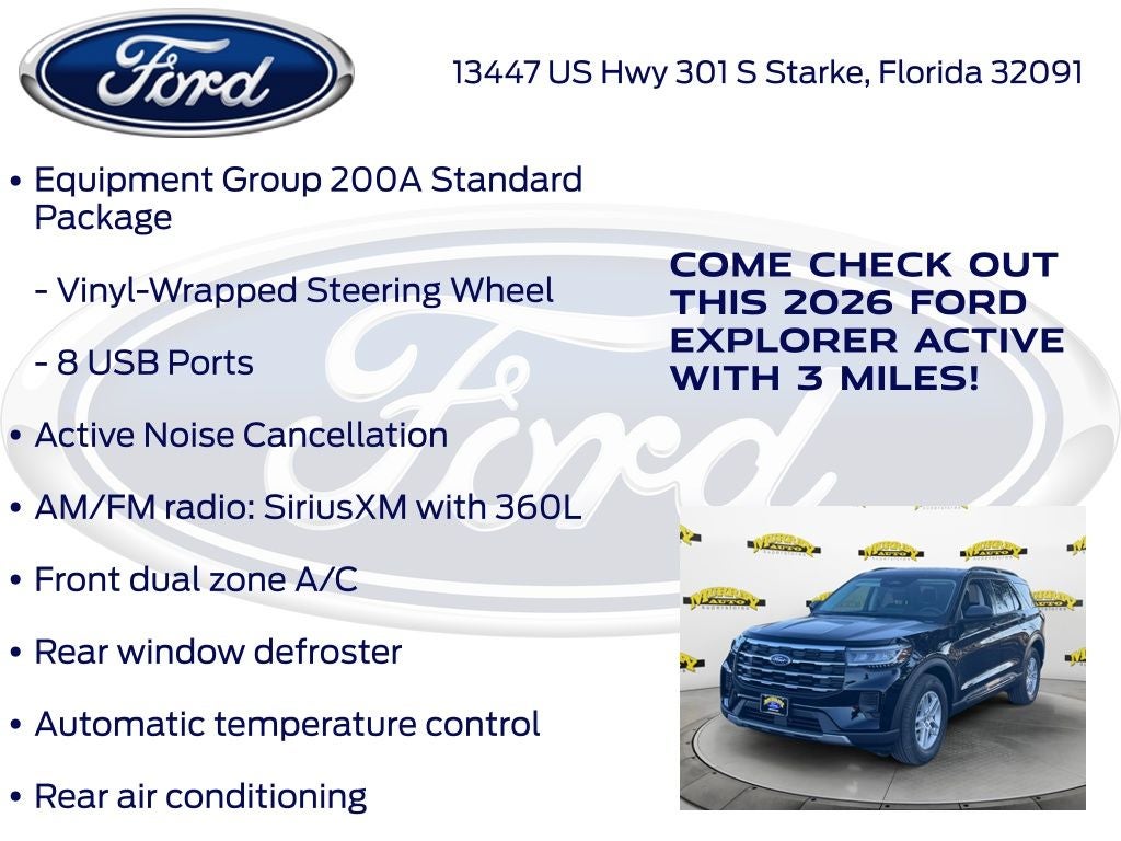 Murray Ford Superstore of Starke is very proud to offer this good-looking 2026 Ford Explorer in Agate Black Metallic This vehicle is readily available and comes with the following Equipment Group 200A Standard Package (Unique Cloth Heated Captain's Chairs, Wheels: 18 Sparkle Silver-Painted Aluminum, and AM/FM Stereo), Explorer Active 200A, 4D Sport Utility, 2.3L EcoBoost I-4, 10-Speed Automatic, RWD, Agate Black Metallic, Dark Space Gray w/Unique Cloth Captain's Chairs or Unique Cloth Heated Captain's Chairs, 3rd row seats: bench, 4-Wheel Disc Brakes, ABS brakes, AM/FM radio: SiriusXM with 360L, Apple CarPlay/Android Auto, Auto High-beam Headlights, Automatic temperature control, Brake assist, Bumpers: body-color, Compass, Delay-off headlights, Driver door bin, Driver vanity mirror, Dual front impact airbags, Dual front side impact airbags, Electronic Stability Control, Emergency communication system: 911 Assist, Exterior Parking Camera Rear, Four wheel independent suspension, Front anti-roll bar, Front Bucket Seats, Front Center Armrest, Front dual zone A/C, Front reading lights, Fully automatic headlights, Heated door mirrors, Illuminated entry, Knee airbag, Low tire pressure warning, Navigation System, Occupant sensing airbag, Outside temperature display, Overhead airbag, Overhead console, Panic alarm, Passenger door bin, Passenger vanity mirror, Power driver seat, Power Liftgate, Power steering, Power windows, Pre-Collision Assist, Rear air conditioning, Rear anti-roll bar, Rear reading lights, Rear window defroster, Rear window wiper, Remote keyless entry, Security system, Speed control, Speed-sensing steering, Speed-Sensitive Wipers, Split folding rear seat, Spoiler, Steering wheel mounted audio controls, Tachometer, Telescoping steering wheel, Tilt steering wheel, Traction control, Trip computer, Unique Cloth Captain's Chairs, Variably intermittent wipers, 6 Speakers, and Air Conditioning;