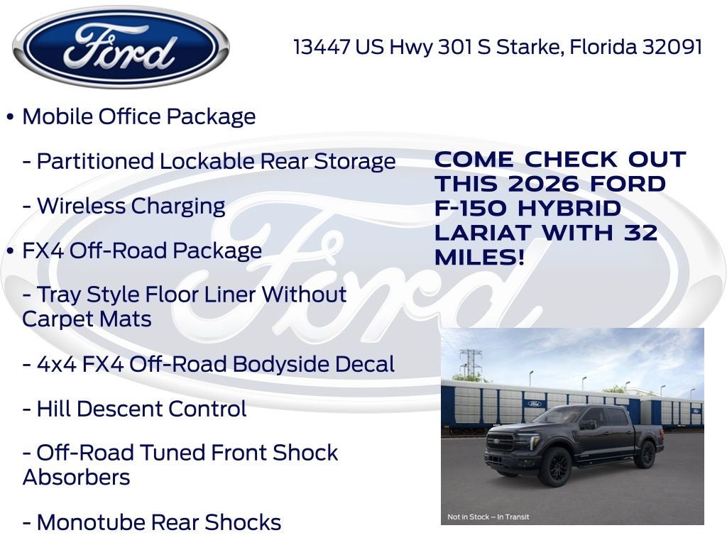 Murray Ford Superstore of Starke is proud to offer this dependable 2026 Ford F-150 in Agate Black Metallic This vehicle is readily available and comes with the following Equipment Group 502A High (2nd Row Heated Seats, ActiveX Trimmed Bucket Seats, Ambient Lighting - Ice Blue Color Only, Head-Up Display, Illuminated Driver and Passenger Visors, Power-Adjustable Pedals with Memory, Power-Sliding Rear Window, and Radio: B&O Unleashed Sound System by Bang & Olufsen), Ford Connectivity Package (1-Year Included), Ford Connectivity Package (one-Time Purchase - 7 Years), FX4 Off-Road Package (4x4 FX4 Off-Road Bodyside Decal, Hill Descent Control, Monotube Rear Shocks, Off-Road Tuned Front Shock Absorbers, and Tray Style Floor Liner Without Carpet Mats), GVWR: 7,400 lbs Payload Package, Internet access capable: 5G Modem - Ford Connectivity Package, Lariat Black Appearance Package (Black Exterior Badging, Black Grille, Black Taillamp Bezels, Body-Color Front and Rear Bumpers, Dark Interior Appliques, and Gray Box Side Decal), Mobile Office Package (Console Worksurface, Partitioned Lockable Rear Storage, and Wireless Charging), F-150 Lariat 502A, 4D SuperCrew, 3.5L PowerBoost Full-Hybrid V6, 10-Speed Automatic, 4WD, Agate Black Metallic, Black w/ActiveX Trimmed 40/Console/40 Front Seat, 4-Wheel Disc Brakes, ABS brakes, Air Conditioning, AM/FM radio: SiriusXM with 360L, Auto High-beam Headlights, Auto-dimming door mirrors, Auto-dimming Rear-View mirror, Automatic temperature control, Brake assist, Compass, Delay-off headlights, Driver door bin, Driver vanity mirror, Driver's Side SecuriCode Keyless-Entry Keypad, Dual front impact airbags, Dual front side impact airbags, Electronic Locking with 3.73 Axle Ratio, Electronic Stability Control, Emergency communication system: SYNC 4 911 Assist, Front anti-roll bar, Front Bucket Seats, Front Center Armrest, Front dual zone A/C, Front fog lights, Front reading lights, Front wheel independent suspension, Fully automatic headlights, Garage door transmitter, Heated door mirrors, Heated front seats, Heated steering wheel, Illuminated entry, Low tire pressure warning, Memory seat, Navigation system: Connected Navigation, Occupant sensing airbag, Outside temperature display, Overhead airbag, Overhead console, Panic alarm, Passenger door bin, Passenger vanity mirror, Power door mirrors, Power driver seat, Power passenger seat, Power steering, Power windows, Pro Power Onboard - 7.2KW, Rain sensing wipers, Rear reading lights, Rear seat center armrest, Rear step bumper, Rear window defroster, Remote keyless entry, Security system, Speed control, Split folding rear seat, Steering wheel mounted audio controls, SYNC 4 with Enhanced Voice Recognition, Tachometer, Telescoping steering wheel, Tilt steering wheel, Traction control, Trip computer, Turn signal indicator mirrors, Variably intermittent wipers, Ventilated front seats, Wheels: 20 Gloss Black Painted Aluminum, 8 Speakers, Radio data system, and Radio: B&O Sound System by Bang and Olufsen;