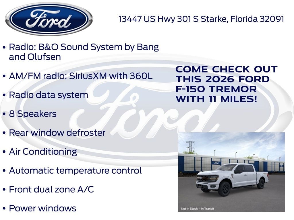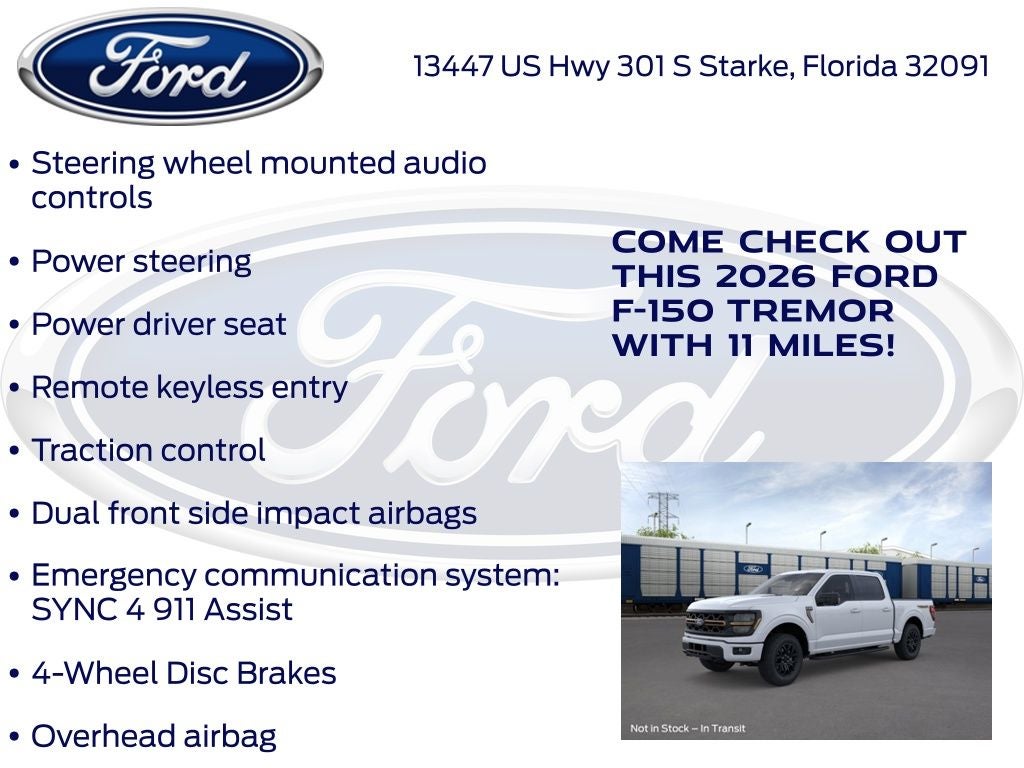 Murray Ford Superstore of Starke is very proud to offer this stout 2026 Ford F-150 in Oxford White This vehicle is readily available and comes with the following Equipment Group 401A Standard (Electronic Locking with 3.73 Axle Ratio, Radio: B&O Sound System by Bang and Olufsen, SYNC 4 with Enhanced Voice Recognition, Unique Sport Cloth 40/Console/40 Power Front Seat, and Wheels: 18 Alloy with Dark Matte Finish), Ford Connectivity Package (1-Year Included), GVWR: 7,050 lbs Payload Package, Internet access capable: 5G Modem - Ford Connectivity Package, Mobile Office Package (Console Worksurface, Partitioned Lockable Rear Storage, and Wireless Charging), Tow/Haul Package (Integrated Trailer Brake Controller), F-150 Tremor 401A, 4D SuperCrew, 3.5L V6 EcoBoost, 10-Speed Automatic, 4WD, Oxford White, Black w/Unique Sport Cloth 40/Console/40 Power Front Seat, 4-Wheel Disc Brakes, 8 Speakers, ABS brakes, Adjustable pedals, Air Conditioning, AM/FM radio: SiriusXM with 360L, Auto High-beam Headlights, Auto-dimming Rear-View mirror, Automatic temperature control, Brake assist, Bumpers: body-color, Compass, Delay-off headlights, Driver door bin, Driver vanity mirror, Dual front impact airbags, Dual front side impact airbags, Electronic Stability Control, Emergency communication system: SYNC 4 911 Assist, Front anti-roll bar, Front Bucket Seats, Front Center Armrest, Front dual zone A/C, Front fog lights, Front reading lights, Front wheel independent suspension, Fully automatic headlights, Heated door mirrors, Heated front seats, Illuminated entry, Low tire pressure warning, Navigation system: Connected Navigation, Occupant sensing airbag, Outside temperature display, Overhead airbag, Overhead console, Panic alarm, Passenger door bin, Passenger vanity mirror, Power door mirrors, Power driver seat, Power passenger seat, Power steering, Power windows, Radio data system, Rear reading lights, Rear step bumper, Rear window defroster, Remote keyless entry, Security system, Speed control, Split folding rear seat, Steering wheel mounted audio controls, Tachometer, Telescoping steering wheel, Tilt steering wheel, Traction control, Trip computer, Turn signal indicator mirrors, and Variably intermittent wipers;