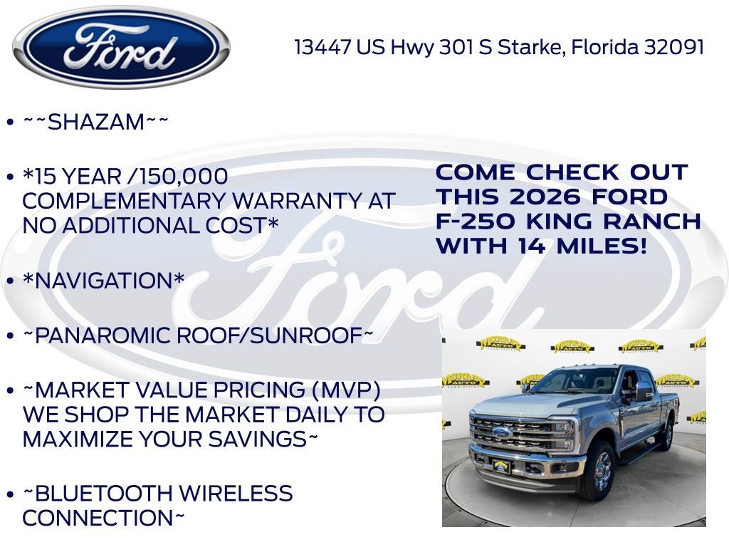 Murray Ford Superstore of Starke is pleased to offer this dependable 2026 Ford F-250SD in Glacier Gray Metallic Tri-Coat This vehicle is readily available and comes with the following 5th Wheel/Gooseneck Hitch Prep Package, Ford Connectivity Package (1-Year Included), FX4 Off-Road Package (Hill Descent Control, Off-Road Specifically Tuned Shock Absorbers, and Unique FX4 Off-Road Box Decal), Internet access capable: 5G Modem - Ford Connectivity Package, Order Code 700A (Flow-Through Console, Radio: B&O Unleashed Sound System by Bang & Olufsen, Unique King Ranch Leather 40/Console/40 Seats, and Wheels: 20 Bright Machined Aluminum), F-250 SuperDuty King Ranch 700A, 4D Crew Cab, 6.7L High Output Power Stroke V8 Diesel, 10-Speed Automatic, 4WD, Glacier Gray Metallic Tri-Coat, Java w/Unique King Ranch Leather 40/Console/40 Seats, 14 Speakers, 250 Amp Alternator, 34 Gallon Fuel Tank, 4-Wheel Disc Brakes, ABS brakes, Adjustable pedals, Air Conditioning, AM/FM radio: SiriusXM with 360L, Auto High-beam Headlights, Auto tilt-away steering wheel, Auto-dimming Rear-View mirror, Automatic temperature control, Brake assist, Compass, Delay-off headlights, Driver door bin, Driver vanity mirror, Dual front impact airbags, Dual front side impact airbags, Electronic Stability Control, Emergency communication system: SYNC 4 911 Assist, Front anti-roll bar, Front Bucket Seats, Front Center Armrest, Front dual zone A/C, Front fog lights, Front reading lights, Fully automatic headlights, Garage door transmitter, Heads-Up Display, Heated door mirrors, Heated front seats, Heated rear seats, Heated steering wheel, Illuminated entry, Leather steering wheel, LED Roof Clearance Lights, Low tire pressure warning, Max Recline Seats, Memory seat, Navigation system: Connected Navigation, Outside temperature display, Overhead airbag, Overhead console, Panic alarm, Passenger door bin, Passenger vanity mirror, Pedal memory, Power door mirrors, Power driver seat, Power passenger seat, Power steering, Power windows, Rain sensing wipers, Rear reading lights, Rear seat center armrest, Rear step bumper, Rear window defroster, Remote keyless entry, Security system, Speed control, Split folding rear seat, Steering wheel memory, Steering wheel mounted audio controls, Tachometer, Telescoping steering wheel, Tilt steering wheel, Traction control, Trip computer, Turn signal indicator mirrors, Twin Panel Power Moonroof, Upfitter Switches (6), Variably intermittent wipers, and Ventilated front seats;