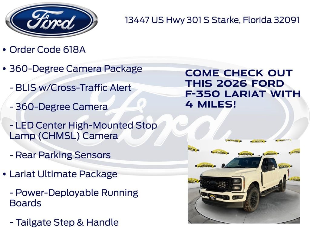Murray Ford Superstore of Starke is proud to offer this trusty 2026 Ford F-350SD in Oxford White This vehicle is readily available and comes with the following 5th Wheel/Gooseneck Hitch Prep Package, Black Appearance Package (6 Ebony Black Angular Running Boards, Black Painted Front Grille Surround, and Wheels: 20 Ebony Black High Gloss), Ford Connectivity Package (1-Year Included), FX4 Off-Road Package (Hill Descent Control, Off-Road Specifically Tuned Shock Absorbers, and Unique FX4 Off-Road Box Decal), Internet access capable: 5G Modem - Ford Connectivity Package, Lariat Premium Package (Pro Trailer Backup Assist and Pro Trailer Hitch Assist), Lariat Ultimate Package (4-Way Adjustable Headrests, Power-Deployable Running Boards, and Radio: B&O Unleashed Sound System by Bang & Olufsen), Order Code 618A (Flow-Through Console and Front ActiveX Trimmed 40/Console/40 Seats), F-350 SuperDuty Lariat 618A, 4D Crew Cab, Power Stroke 6.7L V8 DI 32V OHV Turbodiesel, 10-Speed Automatic, 4WD, Oxford White, Black Onyx w/Front ActiveX Trimmed 40/Console/40 Seats, 250 Amp Alternator, 34 Gallon Fuel Tank, 4-Wheel Disc Brakes, ABS brakes, Adjustable pedals, Air Conditioning, Brake assist, Compass, Delay-off headlights, Dual front impact airbags, Dual front side impact airbags, Electronic Stability Control, Emergency communication system: SYNC 4 911 Assist, Front anti-roll bar, Front reading lights, Fully automatic headlights, Heated door mirrors, Illuminated entry, LED Roof Clearance Lights, Low tire pressure warning, Memory seat, Navigation system: Connected Navigation, Outside temperature display, Overhead airbag, Overhead console, Panic alarm, Passenger vanity mirror, Pedal memory, Power door mirrors, Power driver seat, Power steering, Power windows, Rear Parking Sensors, Rear reading lights, Rear step bumper, Remote keyless entry, Security system, Speed control, Split folding rear seat, Steering wheel mounted audio controls, Tachometer, Telescoping steering wheel, Tilt steering wheel, Traction control, Trip computer, Turn signal indicator mirrors, Upfitter Switches (6), and Variably intermittent wipers;