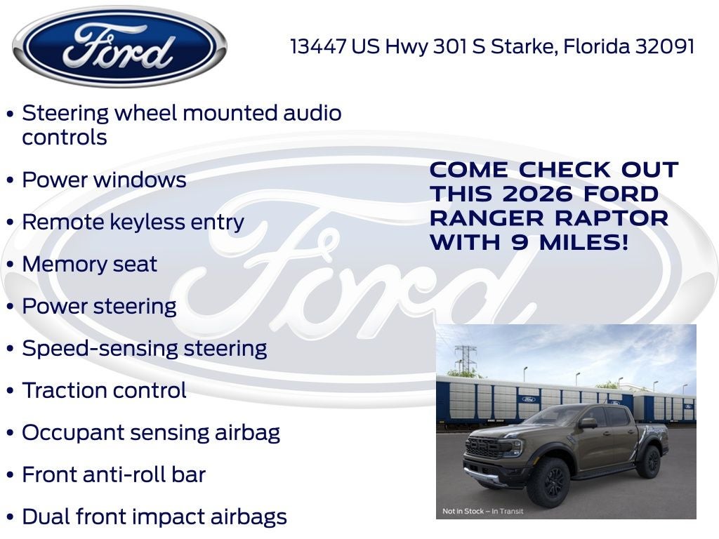Murray Ford Superstore of Starke is very proud to offer this terrific, reliable 2026 Ford Ranger in Marsh Gray This vehicle is readily available and comes with the following Equipment Group 800A Standard (4.27 Axle Ratio, Leather-Trimmed Front Heated Bucket Seats, Radio: B&O Sound System by Bang and Olufsen, SiriusXM with 360L and 3-Month Trial Subscription, SYNC 4A, and Wheels: 17 Inch Gray-Painted Aluminum Alloy), Ranger Raptor 800A, 4D Crew Cab, 3.0L EcoBoost V6, 10-Speed Automatic, 4WD, Marsh Gray, Ebony w/Leather-Trimmed Front Heated Bucket Seats, 10 Speakers, 4-Wheel Disc Brakes, ABS brakes, Air Conditioning, AM/FM radio: SiriusXM with 360L, Auto High-beam Headlights, Auto-dimming Rear-View mirror, Automatic temperature control, Brake assist, Compass, Delay-off headlights, Driver door bin, Driver vanity mirror, Dual front impact airbags, Dual front side impact airbags, Electronic Stability Control, Emergency communication system: SYNC 4 911 Assist, Front anti-roll bar, Front Bucket Seats, Front Center Armrest, Front dual zone A/C, Front fog lights, Front reading lights, Front wheel independent suspension, Fully automatic headlights, Garage door transmitter, Heated door mirrors, Heated front seats, Heated steering wheel, Illuminated entry, Leather Shift Knob, Leather steering wheel, Low tire pressure warning, Memory seat, Navigation System, Occupant sensing airbag, Outside temperature display, Overhead airbag, Overhead console, Panic alarm, Passenger door bin, Passenger vanity mirror, Power door mirrors, Power driver seat, Power passenger seat, Power steering, Power windows, Pre-Collision Assist, Rain sensing wipers, Rear reading lights, Rear seat center armrest, Rear step bumper, Rear window defroster, Remote keyless entry, Security system, Speed control, Speed-sensing steering, Steering wheel mounted audio controls, Telescoping steering wheel, Tilt steering wheel, Traction control, Trip computer, Turn signal indicator mirrors, Variably intermittent wipers, Voltmeter, and Navigation system: Connected Navigation;