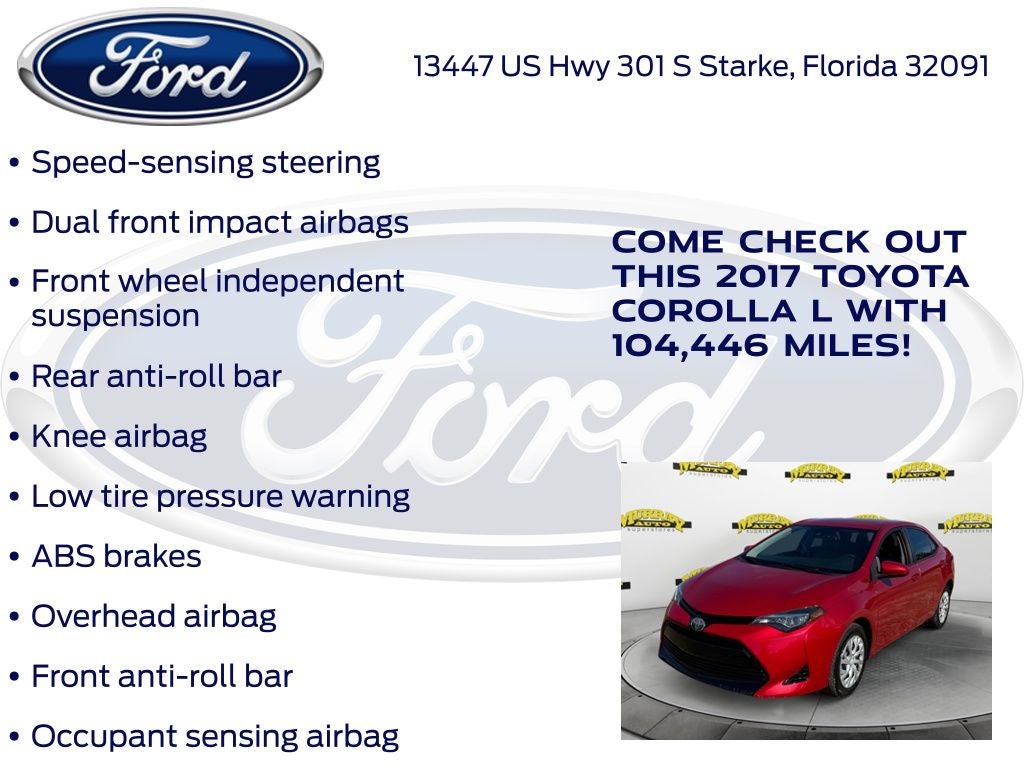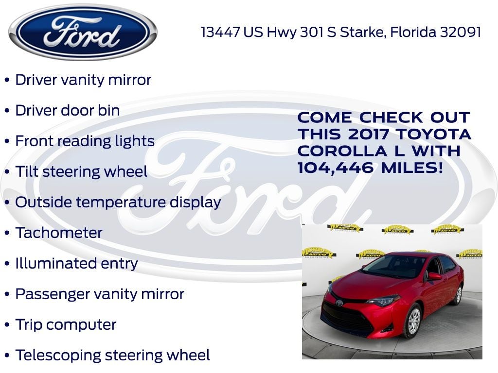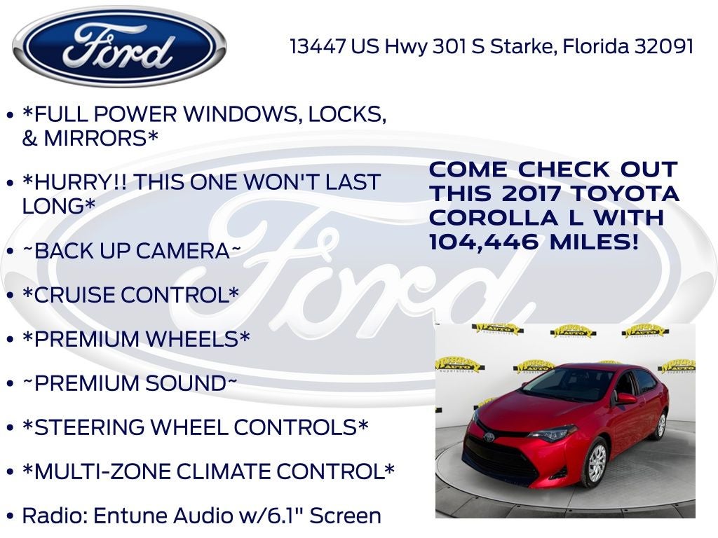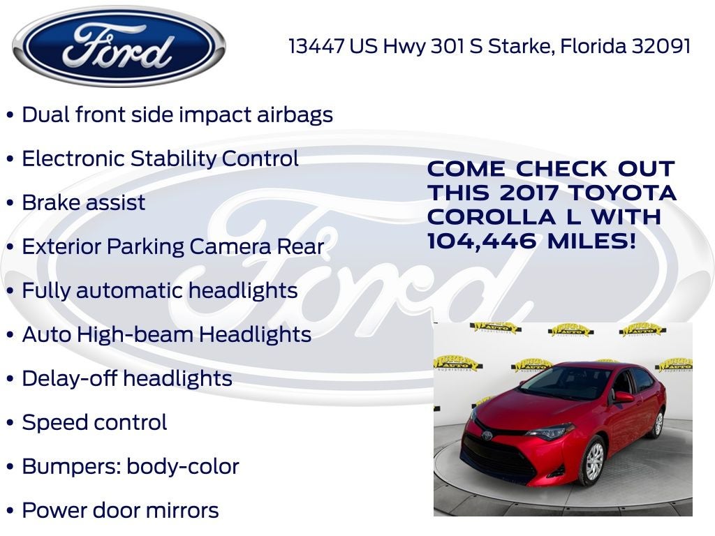 CARFAX One-Owner. Priced below KBB Fair Purchase Price! Odometer is 15515 miles below market average! Murray Ford Superstore of Starke is proud to offer this good-looking 2017 Toyota Corolla in Red This vehicle is readily available and comes with the following 6 Speakers, ABS brakes, Air Conditioning, AM/FM radio, Auto High-beam Headlights, Brake assist, Bumpers: body-color, CD player, Delay-off headlights, Driver door bin, Driver vanity mirror, Dual front impact airbags, Dual front side impact airbags, Electronic Stability Control, Exterior Parking Camera Rear, Fabric Seat Trim, Front anti-roll bar, Front Bucket Seats, Front Center Armrest w/Storage, Front reading lights, Front wheel independent suspension, Fully automatic headlights, Illuminated entry, Knee airbag, Low tire pressure warning, Occupant sensing airbag, Outside temperature display, Overhead airbag, Passenger door bin, Passenger vanity mirror, Power door mirrors, Power steering, Power windows, Radio data system, Radio: Entune Audio w/6.1 Screen, Rear anti-roll bar, Rear window defroster, Speed control, Speed-sensing steering, Split folding rear seat, Steering wheel mounted audio controls, Tachometer, Telescoping steering wheel, Tilt steering wheel, Traction control, Trip computer, and Wheels: 15 x 6.0 Styled Steel;