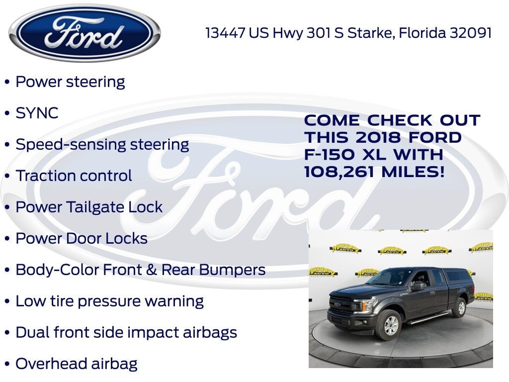 Priced below KBB Fair Purchase Price! Odometer is 25543 miles below market average! Murray Ford Superstore of Starke is proud to offer this stout 2018 Ford F-150 in Magnetic This vehicle is readily available and comes with the following Equipment Group 101A Mid (4.2 Productivity Screen in Instrument Cluster, Cruise Control, Radio: AM/FM Stereo/Single-CD Player, and SYNC), GVWR: 6,300 lbs Payload Package, XL Power Equipment Group (Illuminated Entry, MyKey, Perimeter Alarm, Power Door Locks, Power Front & Rear Windows, Power Glass Sideview Mirrors w/Black Skull Caps, and Power Tailgate Lock), XL Sport Appearance Package (Body-Color Front & Rear Bumpers, Box Side Decals, Fog Lamps, and Wheels: 17 Silver Painted Aluminum), Ford Blue Certified Certified, 3.55 Axle Ratio, 4-Wheel Disc Brakes, 6 Speakers, ABS brakes, Air Conditioning, AM/FM radio, Brake assist, Class IV Trailer Hitch Receiver, Cloth 40/20/40 Front Seat, Compass, Delay-off headlights, Driver door bin, Dual front impact airbags, Dual front side impact airbags, Electronic Stability Control, Exterior Parking Camera Rear, Front anti-roll bar, Front Center Armrest, Front wheel independent suspension, Fully automatic headlights, Low tire pressure warning, Occupant sensing airbag, Outside temperature display, Overhead airbag, Passenger door bin, Passenger vanity mirror, Power steering, Radio: AM/FM Stereo w/6 Speakers, Rear step bumper, Speed-sensing steering, Split folding rear seat, Tachometer, Telescoping steering wheel, Tilt steering wheel, Traction control, Variably intermittent wipers, Voltmeter, and Wheels: 17 Silver Steel;