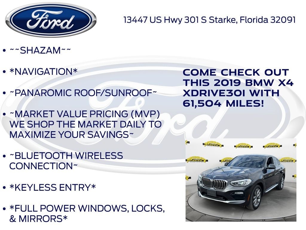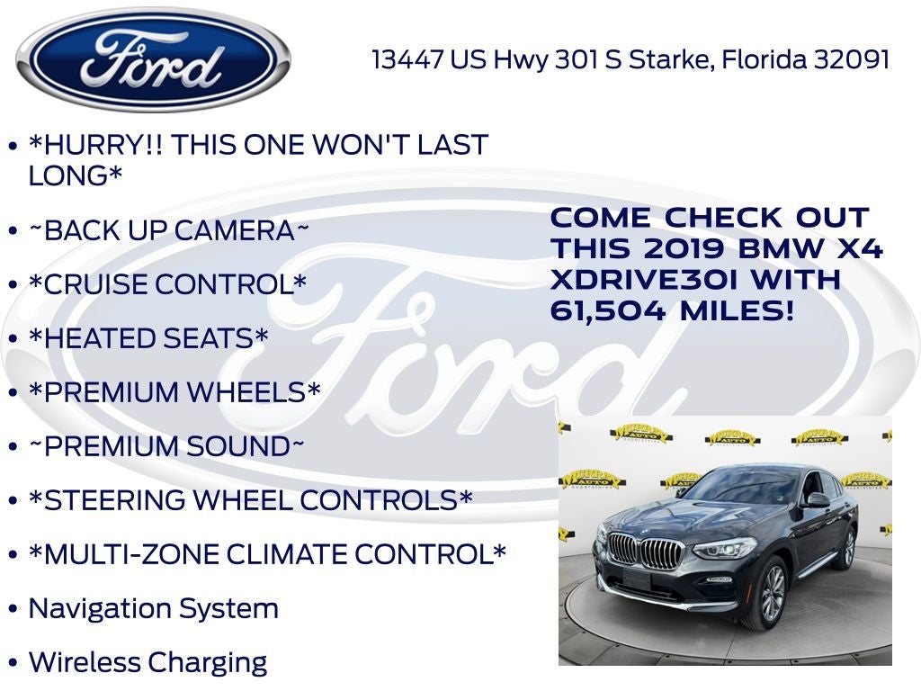 Priced below KBB Fair Purchase Price! Odometer is 9640 miles below market average! Murray Ford Superstore of Starke is pumped up to offer this good-looking 2019 BMW X4 in Dark Graphite Metallic This vehicle is readily available and comes with the following Convenience Package (Comfort Access Keyless Entry, Lumbar Support, and SiriusXM Satellite Radio), Driving Assistance Package (Active Blind Spot Detection, Active Driving Assistant, and Lane Departure Warning System), Premium Package (Gesture Control, Head-Up Display, Heated Front Seats, and Heated Steering Wheel), Wireless Charging (Enhanced USB & Bluetooth® and WiFi Hotspot), 3.39 Axle Ratio, 4-Wheel Disc Brakes, 9 Speakers, ABS brakes, Air Conditioning, Alloy wheels, AM/FM radio, Anti-whiplash front head restraints, Apple CarPlay, Auto-dimming door mirrors, Auto-dimming Rear-View mirror, Automatic temperature control, Bodyside moldings, Brake assist, Bumpers: body-color, CD player, Delay-off headlights, Driver door bin, Driver vanity mirror, Dual front impact airbags, Dual front side impact airbags, Electronic Stability Control, Emergency communication system: BMW Assist eCall, Enhanced USB & Bluetooth® w/Smartphone Integration, Exterior Parking Camera Rear, Four wheel independent suspension, Front anti-roll bar, Front Bucket Seats, Front Center Armrest, Front dual zone A/C, Front fog lights, Front reading lights, Fully automatic headlights, Garage door transmitter, Genuine wood console insert, Genuine wood dashboard insert, Genuine wood door panel insert, Heated door mirrors, Hi-Fi Sound System, Illuminated entry, Leather Shift Knob, Low tire pressure warning, M Sport Suspension, Memory seat, Navigation System, Occupant sensing airbag, Outside temperature display, Overhead airbag, Panic alarm, Passenger door bin, Passenger vanity mirror, Power door mirrors, Power driver seat, Power Front Seats, Power Liftgate, Power moonroof, Power passenger seat, Power steering, Power windows, Radio data system, Radio: AM/FM/HD w/Single-CD, Rain sensing wipers, Rear air conditioning, Rear anti-roll bar, Rear fog lights, Rear reading lights, Rear seat center armrest, Rear window defroster, Remote keyless entry, Security system, SensaTec Upholstery, Speed control, Speed-sensing steering, Speed-Sensitive Wipers, Split folding rear seat, Spoiler, Sport Bucket Seats, Sport steering wheel, Steering wheel mounted audio controls, Tachometer, Telescoping steering wheel, Tilt steering wheel, Traction control, Trip computer, Turn signal indicator mirrors, Variably intermittent wipers, and Wheels: 19 x 7.5 V-Spoke (Style 692);