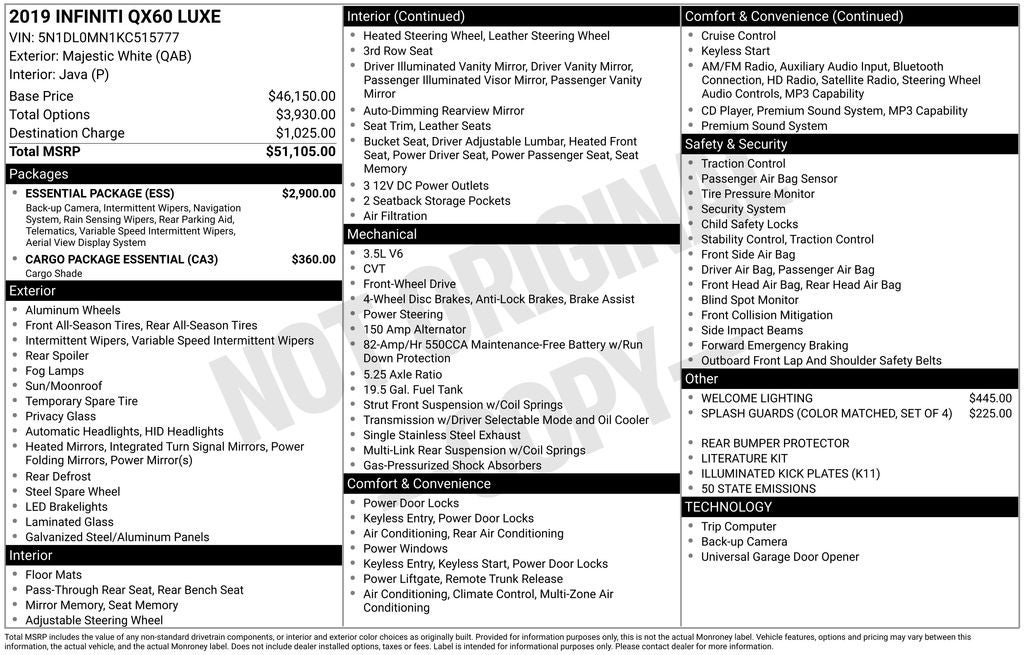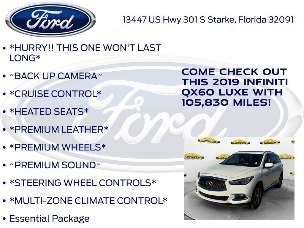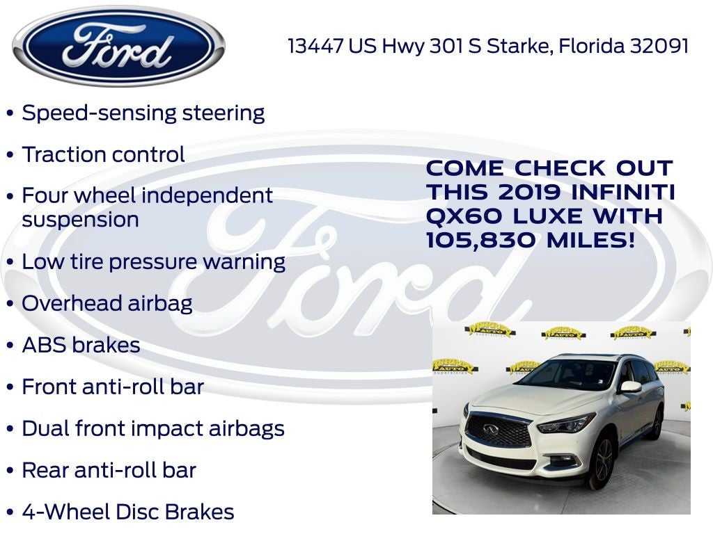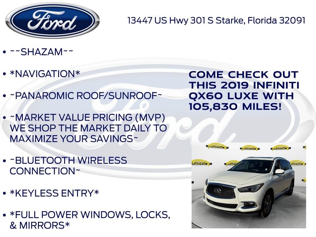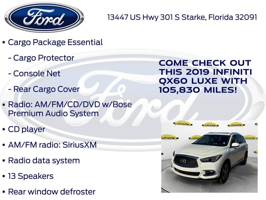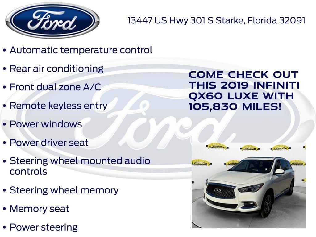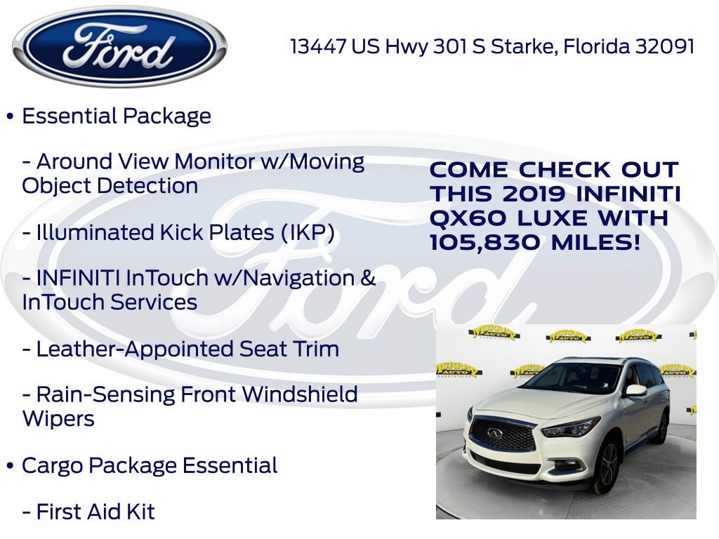 Odometer is 851 miles below market average! Murray Ford Superstore of Starke is pleased to offer this good-looking 2019 INFINITI QX60 in Majestic White This vehicle is readily available and comes with the following Cargo Package Essential (Cargo Protector, Console Net, First Aid Kit, and Rear Cargo Cover), Essential Package (Around View Monitor w/Moving Object Detection, Front & Rear Sonar System (2FR/2RR), Illuminated Kick Plates (IKP), INFINITI InTouch w/Navigation & InTouch Services, Leather-Appointed Seat Trim, Rain-Sensing Front Windshield Wipers, and Voice Recognition for Navigation Functions), 13 Speakers, 3rd row seats: bench, 4-Wheel Disc Brakes, 5.25 Axle Ratio, ABS brakes, Air Conditioning, Alloy wheels, AM/FM radio: SiriusXM, Anti-whiplash front head restraints, Auto-dimming Rear-View mirror, Automatic temperature control, Bodyside moldings, Brake assist, Bumpers: body-color, Carpeted Floor Mats (4-Piece Set), CD player, Delay-off headlights, Driver door bin, Driver vanity mirror, Dual front impact airbags, Dual front side impact airbags, Electronic Stability Control, Four wheel independent suspension, Front anti-roll bar, Front Bucket Seats, Front Center Armrest w/Storage, Front dual zone A/C, Front fog lights, Front reading lights, Fully automatic headlights, Garage door transmitter: HomeLink, Heated door mirrors, Heated Front Seats, Heated front seats, Heated steering wheel, Illuminated entry, Illuminated Kick Plates (K11), Leather steering wheel, Leatherette Seat Trim, Literature Kit, Low tire pressure warning, Memory seat, Occupant sensing airbag, Outside temperature display, Overhead airbag, Overhead console, Panic alarm, Passenger door bin, Passenger vanity mirror, Power door mirrors, Power driver seat, Power Liftgate, Power moonroof, Power passenger seat, Power steering, Power windows, Radio data system, Radio: AM/FM/CD/DVD w/Bose Premium Audio System, Rear air conditioning, Rear anti-roll bar, Rear Bumper Protector, Rear reading lights, Rear seat center armrest, Rear window defroster, Rear window wiper, Reclining 3rd row seat, Remote keyless entry, Roof rack: rails only, Security system, Speed control, Speed-sensing steering, Speed-Sensitive Wipers, Splash Guards (Color Matched, Set of 4), Split folding rear seat, Spoiler, Steering wheel memory, Steering wheel mounted audio controls, Tachometer, Telescoping steering wheel, Tilt steering wheel, Traction control, Trip computer, Turn signal indicator mirrors, Variably intermittent wipers, Welcome Lighting, and Wheels: 18 Triple 5-Spoke Aluminum-Alloy;
