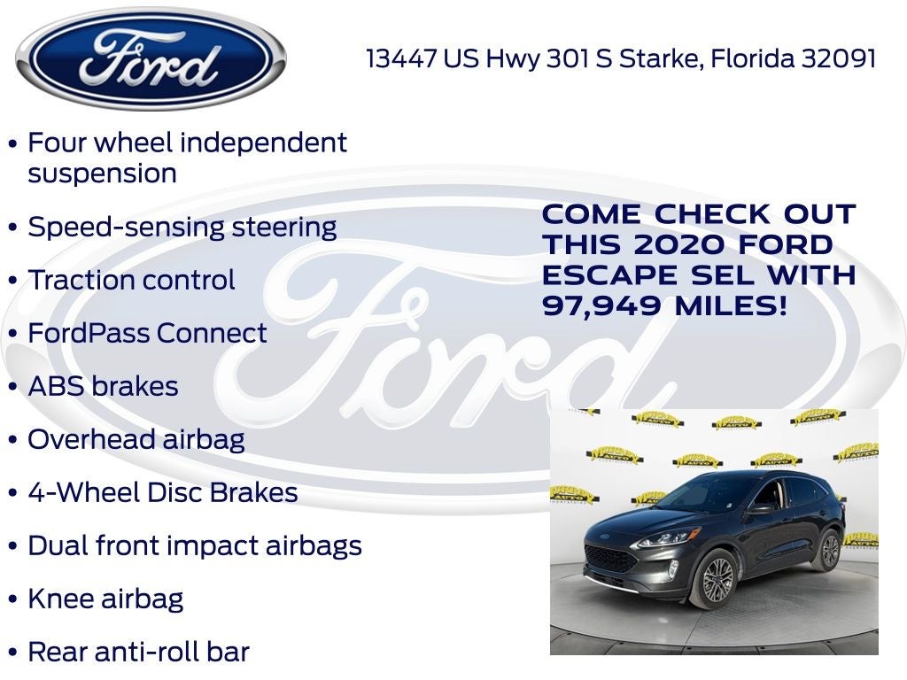 Recent Arrival! CARFAX One-Owner. Murray Ford Superstore of Starke is proud to offer this fantastic 2020 Ford Escape in Magnetic This vehicle is readily available and comes with the following Equipment Group 301A, Ford Co-Pilot360 Assist (Adaptive Cruise Control w/Stop-and-Go and Voice-Activated Touchscreen Navigation System), Ford Blue Certified Certified, 18 Machined-Face Aluminum Wheels, 3.52 Axle Ratio, 4-Wheel Disc Brakes, 6 Speakers, ABS brakes, Air Conditioning, Alloy wheels, AM/FM radio: SiriusXM, AM/FM Stereo, Auto High-beam Headlights, Automatic temperature control, Brake assist, Bumpers: body-color, Compass, Delay-off headlights, Driver door bin, Driver vanity mirror, Dual front impact airbags, Dual front side impact airbags, Electronic Stability Control, Emergency communication system: SYNC 3 911 Assist, Exterior Parking Camera Rear, FordPass Connect, Four wheel independent suspension, Front anti-roll bar, Front Bucket Seats, Front Center Armrest, Front fog lights, Front reading lights, Fully automatic headlights, Heated ActiveX Front Sport Contour Bucket Seats, Heated door mirrors, Heated front seats, Heated steering wheel, Illuminated entry, Knee airbag, Leather steering wheel, Low tire pressure warning, Memory seat, Occupant sensing airbag, Outside temperature display, Overhead airbag, Overhead console, Panic alarm, Passenger door bin, Passenger vanity mirror, Power door mirrors, Power driver seat, Power Liftgate, Power steering, Power windows, Radio data system, Rear anti-roll bar, Rear reading lights, Rear seat center armrest, Rear window defroster, Rear window wiper, Remote keyless entry, Speed control, Speed-sensing steering, Speed-Sensitive Wipers, Split folding rear seat, Spoiler, Steering wheel mounted audio controls, SYNC 3 Communications & Entertainment System, Tachometer, Telescoping steering wheel, Tilt steering wheel, Traction control, Trip computer, and Variably intermittent wipers;