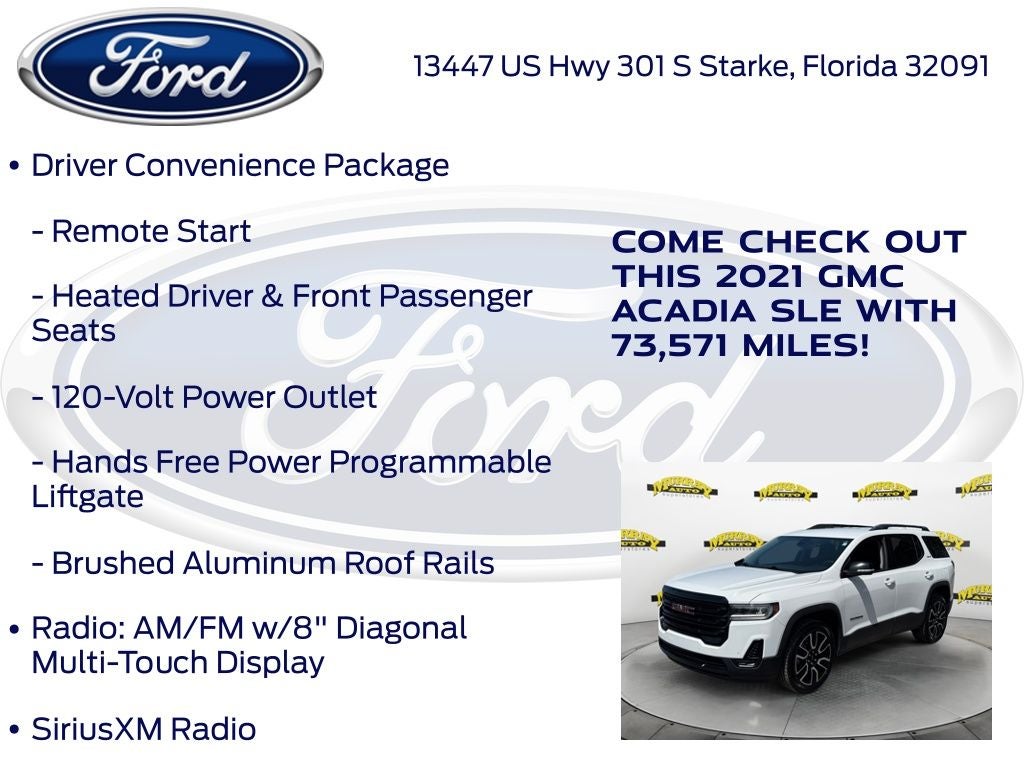 CARFAX One-Owner. Murray Ford Superstore of Starke is excited to offer this gorgeous-looking 2021 GMC Acadia in Summit White This vehicle is readily available and comes with the following Cargo Package (LPO) (Cargo Net and Retractable Cargo Shade), Driver Convenience Package (120-Volt Power Outlet, 8-Way Power Driver Seat Adjuster, Brushed Aluminum Roof Rails, Hands Free Power Programmable Liftgate, Heated Driver & Front Passenger Seats, Power Driver Lumbar Control Seat Adjuster, and Remote Start), Elevation Edition (20 Machined Aluminum Wheels and Gloss Black Roof Rails), Preferred Equipment Group 3SA, FWD, Jet Black Cloth, 155 Amp Alternator, 3.80 Final Drive Axle Ratio, 3rd row seats: split-bench, 4-Way Manual Driver Seat Adjuster, 4-Way Manual Passenger Seat Adjuster, 4-Wheel Disc Brakes, 6 Speakers, 6-Passenger (2-2-2 Seating Configuration), 6-Speaker Audio System Feature, ABS brakes, Air Conditioning, Alloy wheels, AM/FM radio: SiriusXM, Apple CarPlay/Android Auto, Automatic Emergency Braking, Automatic temperature control, Brake assist, Bumpers: body-color, Compass, Delay-off headlights, Driver door bin, Driver vanity mirror, Dual front impact airbags, Dual front side impact airbags, Electronic Stability Control, Emergency communication system: OnStar and GMC connected services capable, Following Distance Indicator, Forward Collision Alert, Four wheel independent suspension, Front & Rear Park Assist, Front anti-roll bar, Front Bucket Seats, Front Center Armrest, Front dual zone A/C, Front Pedestrian Braking, Front reading lights, Fully automatic headlights, Heated door mirrors, Illuminated entry, IntelliBeam Automatic High-Beam Headlamps, Knee airbag, Lane Keep Assist w/Lane Departure Warning, Low tire pressure warning, Occupant sensing airbag, Outside temperature display, Overhead airbag, Overhead console, Panic alarm, Passenger door bin, Passenger vanity mirror, Power door mirrors, Power steering, Power windows, Premium audio system: GMC Infotainment System, Premium Cloth Seat Trim, Radio data system, Radio: AM/FM w/8 Diagonal Multi-Touch Display, Rear air conditioning, Rear anti-roll bar, Rear reading lights, Rear window defroster, Rear window wiper, Remote keyless entry, Security system, SiriusXM Radio, Speed control, Speed-sensing steering, Spoiler, Steering wheel mounted audio controls, Tachometer, Telescoping steering wheel, Tilt steering wheel, Traction control, Trip computer, Turn signal indicator mirrors, Variably intermittent wipers, Voltmeter, Wheels: 18 Machined Aluminum w/Dark Accents, Wheels: 20 Machined Aluminum (DISC), and Wireless Apple CarPlay/Wireless Android Auto;