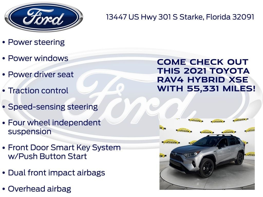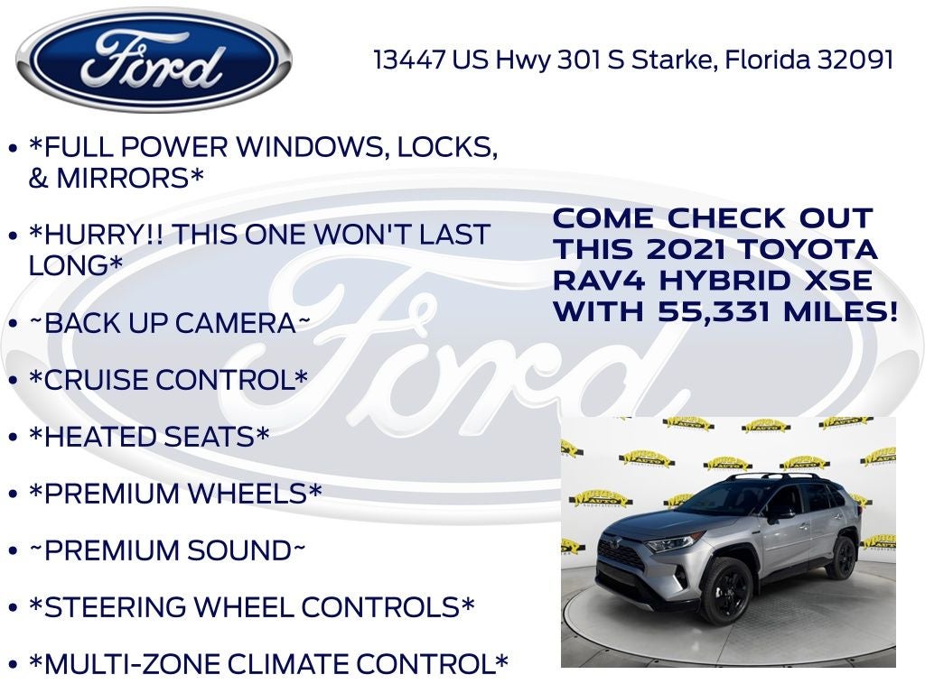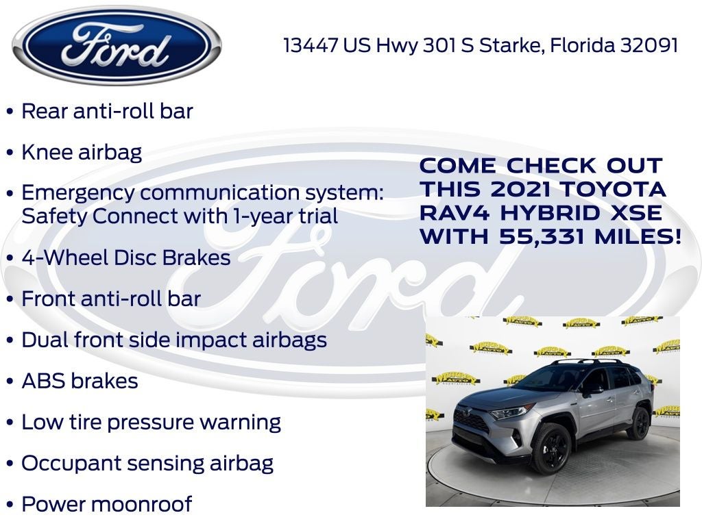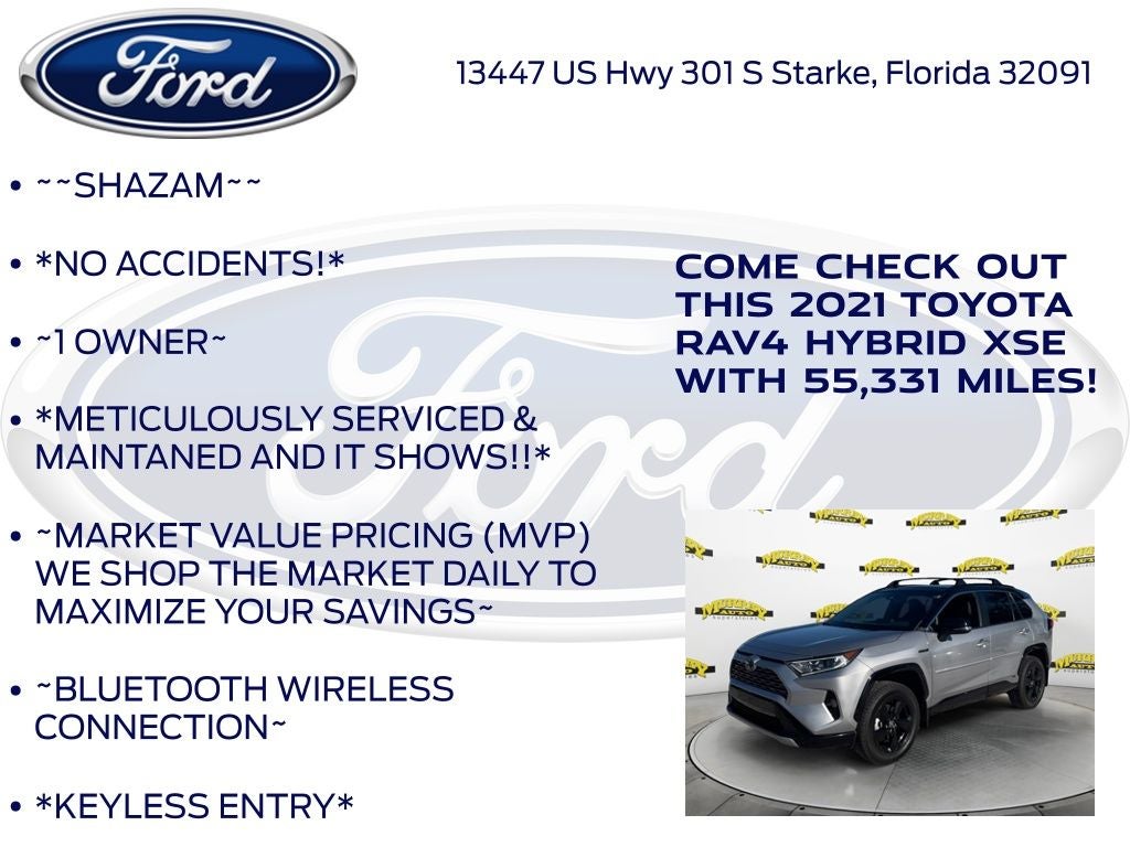 CARFAX One-Owner. Priced below KBB Fair Purchase Price! Odometer is 14932 miles below market average! Murray Ford Superstore of Starke is pumped up to offer this outstanding 2021 Toyota RAV4 Hybrid in Midnight Black Metallic This vehicle is readily available and comes with the following 2.5L 4-Cylinder, 3 Spoke Leather Steering Wheel, 4-Wheel Disc Brakes, 6 Speakers, ABS brakes, Air Conditioning, Alloy wheels, AM/FM radio: SiriusXM, Anti-Theft System, Apple CarPlay/Android Auto, Auto High-beam Headlights, Auto-dimming Rear-View mirror, Automatic temperature control, Axle Ratio: TBD, Brake assist, Bumpers: body-color, Delay-off headlights, Driver door bin, Driver vanity mirror, Dual front impact airbags, Dual front side impact airbags, Electronic Stability Control, Emergency communication system: Safety Connect with 1-year trial, Four wheel independent suspension, Front anti-roll bar, Front Bucket Seats, Front Center Armrest, Front Door Smart Key System w/Push Button Start, Front dual zone A/C, Front Fog & Driving Lamp, Front fog lights, Front reading lights, Front Seat Heating, Fully automatic headlights, Garage door transmitter: HomeLink, Heated door mirrors, Heated Front Seats, Heated front seats, Illuminated entry, Knee airbag, Lane Departure Warning System, Leather Shift Knob, Low tire pressure warning, Occupant sensing airbag, Outside temperature display, Overhead airbag, Overhead console, Panic alarm, Passenger door bin, Passenger vanity mirror, Power door mirrors, Power driver seat, Power Liftgate, Power moonroof, Power steering, Power windows, Radio data system, Radio: Audio Plus, Rear anti-roll bar, Rear seat center armrest, Rear window defroster, Rear window wiper, Remote keyless entry, Roof rack: rails only, Security system, SofTex Seat Trim (EC), Speed control, Speed-sensing steering, Split folding rear seat, Spoiler, Steering wheel mounted audio controls, Telescoping steering wheel, Tilt steering wheel, Traction control, Trip computer, Turn signal indicator mirrors, Variably intermittent wipers, and Wheels: 18 x 7.0J Black-Painted Aluminum Alloy;