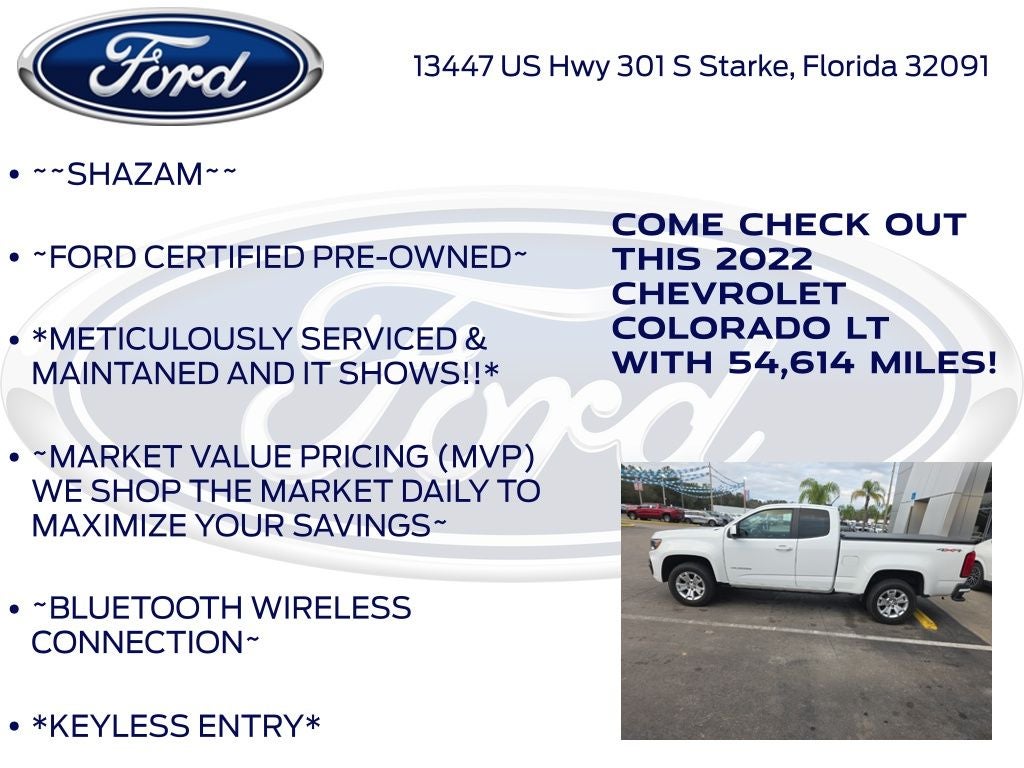 Recent Arrival! Odometer is 17860 miles below market average! Murray Ford Superstore of Starke is pumped up to offer this beautiful 2022 Chevrolet Colorado in Summit White This vehicle is readily available and comes with the following Preferred Equipment Group 4LT (Enhanced Driver Instrument Information Display and Rear Vision Camera), Safety Package (Forward Collision Alert, Lane Departure Warning System, and Ultrasonic Rear Park Assist), Ford Blue Advantage: Blue Certified Certified, 4WD, 4-Wheel Disc Brakes, 4.10 Rear Axle Ratio, 6 Speakers, 6-Speaker Audio System Feature, ABS brakes, Air Conditioning, Alloy wheels, AM/FM radio: SiriusXM, Apple CarPlay/Android Auto, Auto-dimming Rear-View mirror, Bumpers: body-color, Cloth Seat Trim, Compass, Delay-off headlights, Driver 6-Way Power Seat Adjuster, Driver door bin, Driver vanity mirror, Dual front impact airbags, Dual front side impact airbags, Electronic Stability Control, Exterior Parking Camera Rear, Front anti-roll bar, Front Bucket Seats, Front Center Armrest, Front License Plate Kit, Front reading lights, Front wheel independent suspension, Fully automatic headlights, Illuminated entry, Low tire pressure warning, Occupant sensing airbag, Outside temperature display, Overhead airbag, Overhead console, Panic alarm, Passenger door bin, Passenger vanity mirror, Power door mirrors, Power driver seat, Power steering, Power windows, Premium audio system: Chevrolet Infotainment 3, Radio data system, Radio: Chevrolet Infotainment 3 System, Rear step bumper, Remote keyless entry, Security system, SiriusXM Radio, Speed control, Speed-sensing steering, Split folding rear seat, Steering wheel mounted audio controls, Tachometer, Telescoping steering wheel, Tilt steering wheel, Traction control, Trip computer, Variably intermittent wipers, and Wheels: 17 x 8 Blade Silver Metallic Cast Alloy;
