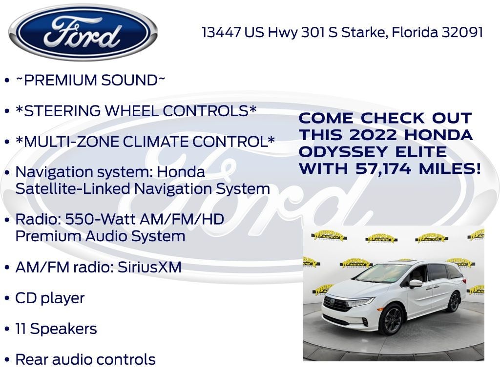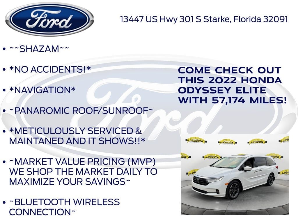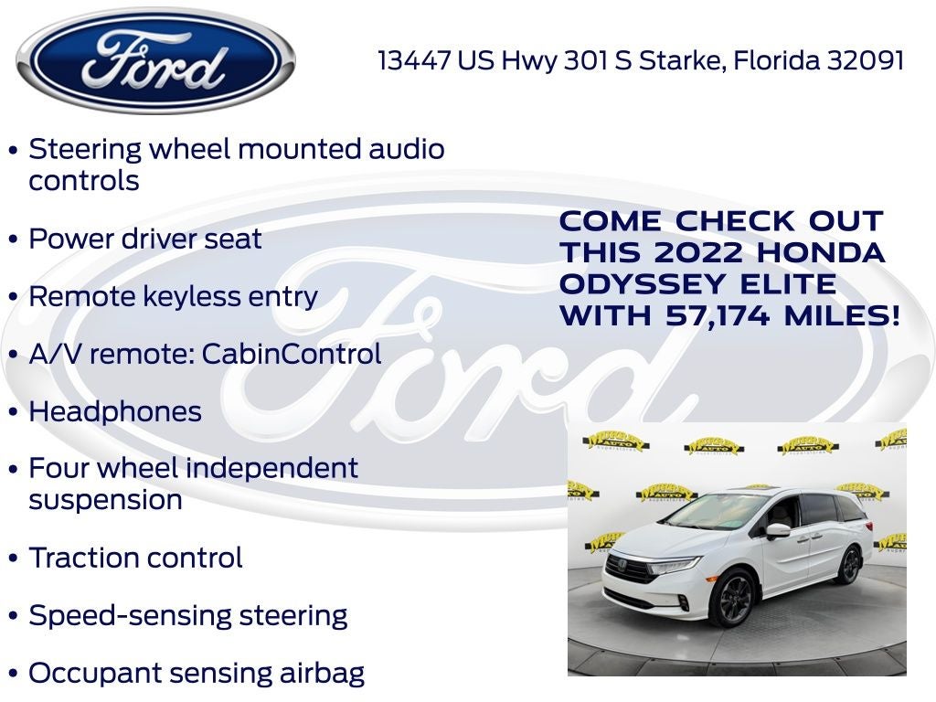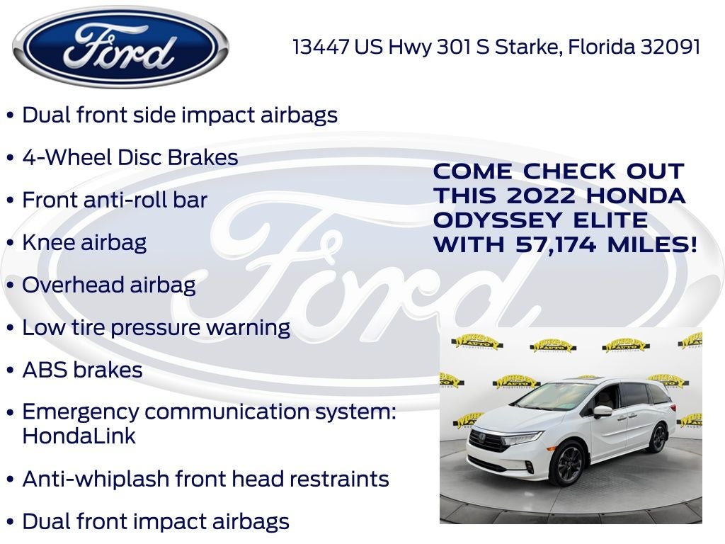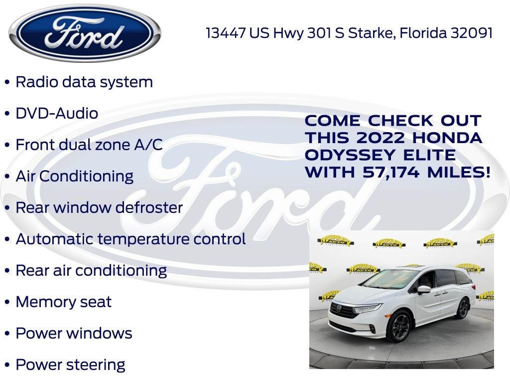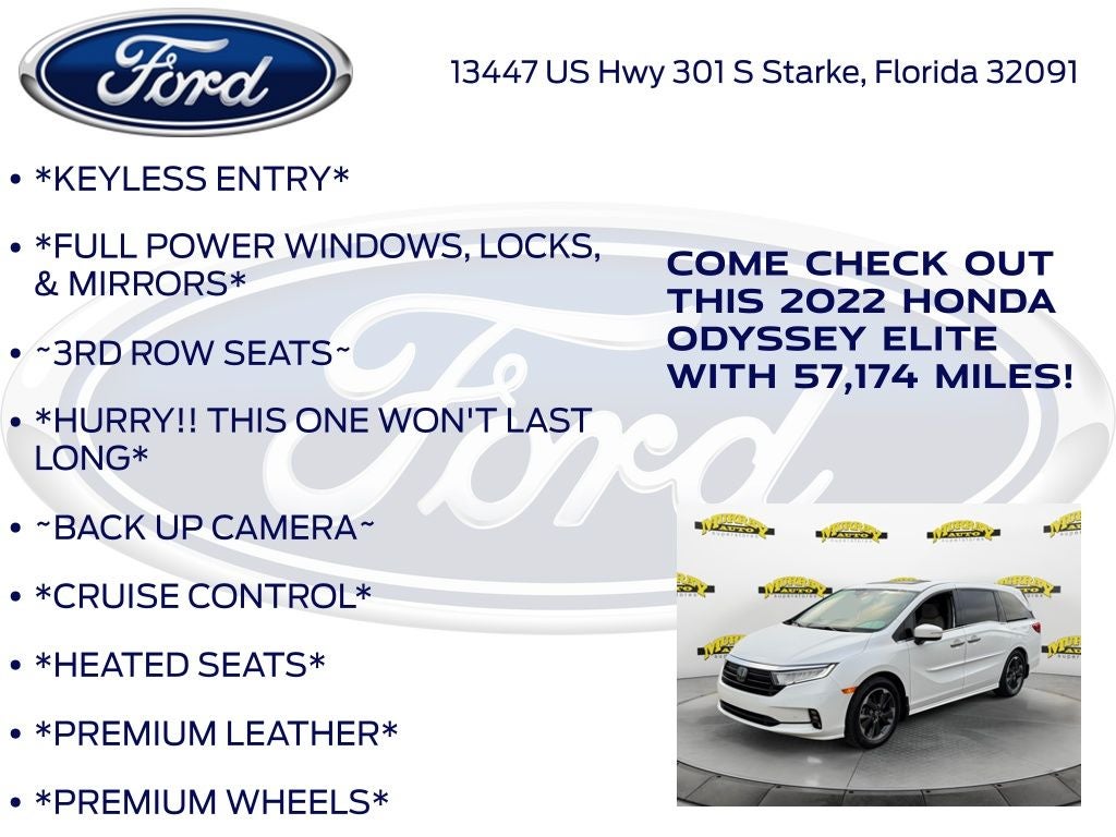 Odometer is 5998 miles below market average! Murray Ford Superstore of Starke is excited to offer this charming 2022 Honda Odyssey in Platinum White This vehicle is readily available and comes with the following 11 Speakers, 3.61 Axle Ratio, 3rd row seats: split-bench, 4-Wheel Disc Brakes, A/V remote: CabinControl, ABS brakes, Adaptive Cruise Control: Adaptive Cruise Control (ACC) with Low-Speed Follow, Air Conditioning, Alloy wheels, AM/FM radio: SiriusXM, Anti-whiplash front head restraints, Apple CarPlay/Android Auto, Auto High-beam Headlights, Auto-dimming door mirrors, Auto-dimming Rear-View mirror, Automatic temperature control, Blind Spot Information (BSI) System warning, Brake assist, Bumpers: body-color, CD player, Compass, Delay-off headlights, Driver door bin, Driver vanity mirror, Driver's Seat Mounted Armrest, Dual front impact airbags, Dual front side impact airbags, DVD-Audio, Electronic Stability Control, Emergency communication system: HondaLink, Exterior Parking Camera Rear, Forward collision: Collision Mitigation Braking System (CMBS) + FCW mitigation, Four wheel independent suspension, Front anti-roll bar, Front Bucket Seats, Front dual zone A/C, Front fog lights, Front reading lights, Fully automatic headlights, Garage door transmitter: HomeLink, Headphones, Heated & Ventilated Front Bucket Seats, Heated door mirrors, Heated front seats, Heated steering wheel, Illuminated entry, Knee airbag, Lane departure: Lane Keeping Assist System (LKAS) active, Leather Seat Trim, Leather steering wheel, Low tire pressure warning, Memory seat, Navigation system: Honda Satellite-Linked Navigation System, Occupant sensing airbag, Outside temperature display, Overhead airbag, Overhead console, Panic alarm, Passenger door bin, Passenger seat mounted armrest, Passenger vanity mirror, Power door mirrors, Power driver seat, Power Liftgate, Power moonroof, Power passenger seat, Power steering, Power windows, Radio data system, Radio: 550-Watt AM/FM/HD Premium Audio System, Rain sensing wipers, Rear air conditioning, Rear anti-roll bar, Rear audio controls, Rear reading lights, Rear seat center armrest, Rear window defroster, Rear window wiper, Reclining 3rd row seat, Remote keyless entry, Security system, Speed control, Speed-sensing steering, Speed-Sensitive Wipers, Split folding rear seat, Spoiler, Steering wheel mounted audio controls, Tachometer, Telescoping steering wheel, Tilt steering wheel, Traction control, Trip computer, Turn signal indicator mirrors, Variably intermittent wipers, Ventilated front seats, and Wheels: 19 Unique Machine-Finished Alloy;