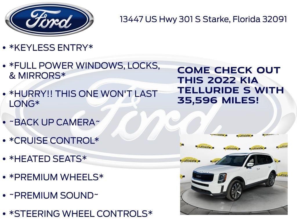 Recent Arrival! Priced below KBB Fair Purchase Price! Odometer is 27337 miles below market average! Murray Ford Superstore of Starke is proud to offer this stunning-looking 2022 Kia Telluride in Glacial White Pearl This vehicle is readily available and comes with the following 20 x 7.5 Machined Alloy Wheels, 3.648 Axle Ratio, 3rd row seats: split-bench, 4-Wheel Disc Brakes, 6 Speakers, ABS brakes, Air Conditioning, Alloy wheels, AM/FM radio: SiriusXM, Apple CarPlay & Android Auto, Automatic temperature control, Brake assist, Bumpers: body-color, Delay-off headlights, Driver door bin, Driver vanity mirror, Dual front impact airbags, Dual front side impact airbags, Electronic Stability Control, Emergency communication system: 911 Connect, Four wheel independent suspension, Front anti-roll bar, Front Bucket Seats, Front Center Armrest, Front dual zone A/C, Front reading lights, Fully automatic headlights, Heated door mirrors, Heated Front Bucket Seats, Heated front seats, Hybrid Cargo Net, Illuminated entry, Knee airbag, Leather Shift Knob, Leather steering wheel, Low tire pressure warning, Navigation System, Occupant sensing airbag, Outside temperature display, Overhead airbag, Overhead console, Panic alarm, Passenger door bin, Passenger vanity mirror, Power door mirrors, Power driver seat, Power moonroof, Power steering, Power windows, Radio data system, Radio: AM/FM Display Audio System, Rear air conditioning, Rear anti-roll bar, Rear audio controls, Rear reading lights, Rear window defroster, Rear window wiper, Reclining 3rd row seat, Remote keyless entry, Roof rack: rails only, Security system, Smart Key w/ Push Button and Remote Start, Speed control, Speed-sensing steering, Split folding rear seat, Spoiler, Steering wheel mounted audio controls, Synthetic Leather Seat Trim, Tachometer, Telescoping steering wheel, Tilt steering wheel, Traction control, Trip computer, Turn signal indicator mirrors, and Variably intermittent wipers;
