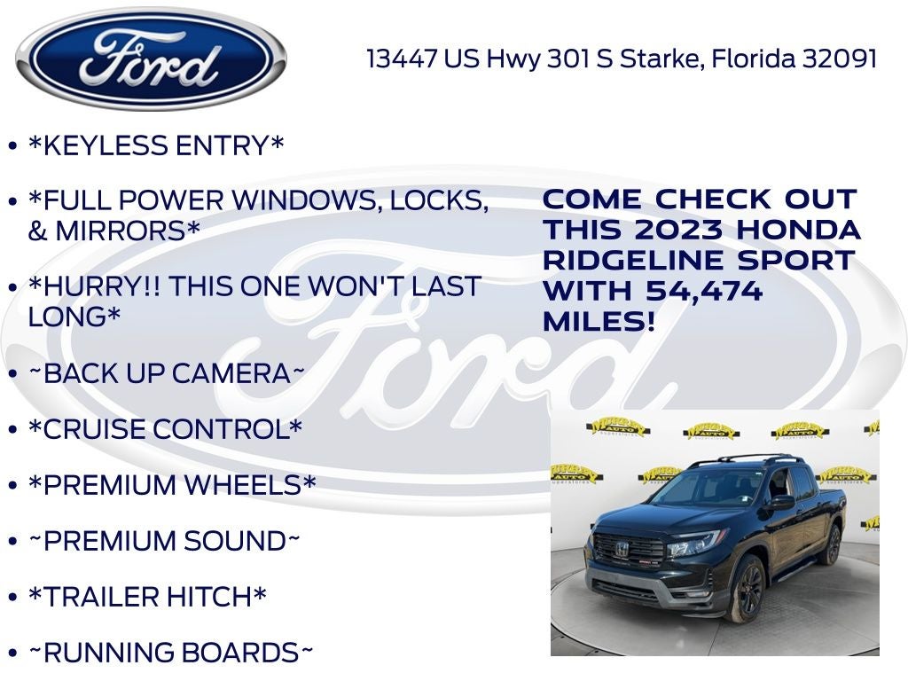 CARFAX One-Owner. Murray Ford Superstore of Starke is pumped up to offer this great 2023 Honda Ridgeline in Crystal Black Pearl This vehicle is readily available and comes with the following Black Cloth, 4-Wheel Disc Brakes, 4.33 Axle Ratio, 7 Speakers, ABS brakes, Air Conditioning, Alloy wheels, AM/FM radio, Apple CarPlay/Android Auto, Automatic temperature control, Bluetooth® Hands-Free Link, Brake assist, Bumpers: body-color, Cloth Seat Trim, Delay-off headlights, Driver door bin, Driver vanity mirror, Driver's Seat Mounted Armrest, Dual front impact airbags, Dual front side impact airbags, Electronic Stability Control, Exterior Parking Camera Rear, Four wheel independent suspension, Front anti-roll bar, Front Bucket Seats, Front dual zone A/C, Front fog lights, Front reading lights, Fully automatic headlights, Garage door transmitter: HomeLink, Illuminated entry, Low tire pressure warning, Occupant sensing airbag, Outside temperature display, Overhead airbag, Overhead console, Panic alarm, Passenger door bin, Passenger seat mounted armrest, Passenger vanity mirror, Power door mirrors, Power steering, Power windows, Radio data system, Radio: 215-Watt Audio System w/7 Speakers, Rear air conditioning, Rear anti-roll bar, Rear reading lights, Rear seat center armrest, Rear step bumper, Rear window defroster, Remote keyless entry, Security system, Speed control, Speed-sensing steering, Split folding rear seat, Steering wheel mounted audio controls, Tachometer, Telescoping steering wheel, Tilt steering wheel, Traction control, Trip computer, Variably intermittent wipers, and Wheels: 18 Shark Gray Alloy;