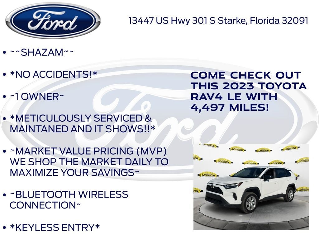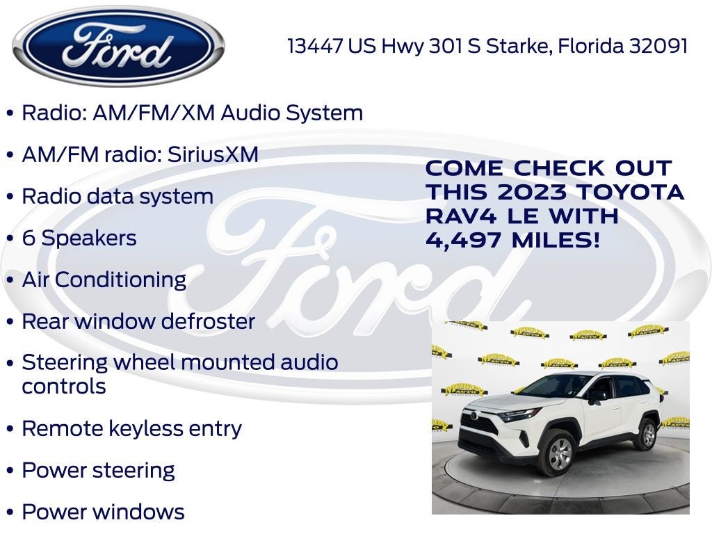 CARFAX One-Owner. Murray Ford Superstore of Starke is very proud to offer this gorgeous-looking 2023 Toyota RAV4 in Ice Cap This vehicle is readily available and comes with the following Black w/Fabric Seat Trim, 17 Steel Wheels, 4-Wheel Disc Brakes, 6 Speakers, ABS brakes, Air Conditioning, AM/FM radio: SiriusXM, Auto High-beam Headlights, Axle Ratio: 3.177, Brake assist, Bumpers: body-color, Driver door bin, Driver vanity mirror, Dual front impact airbags, Dual front side impact airbags, Electronic Stability Control, Emergency communication system: Safety Connect (10-year trial), Exterior Parking Camera Rear, Fabric Seat Trim, Four wheel independent suspension, Front anti-roll bar, Front Bucket Seats, Front Center Armrest, Front reading lights, Illuminated entry, Knee airbag, Low tire pressure warning, Occupant sensing airbag, Outside temperature display, Overhead airbag, Overhead console, Panic alarm, Passenger door bin, Passenger vanity mirror, Power door mirrors, Power steering, Power windows, Radio data system, Radio: AM/FM/XM Audio System, Rear anti-roll bar, Rear seat center armrest, Rear window defroster, Rear window wiper, Remote keyless entry, Speed control, Speed-sensing steering, Split folding rear seat, Spoiler, Steering wheel mounted audio controls, Tachometer, Telescoping steering wheel, Tilt steering wheel, Traction control, and Trip computer;