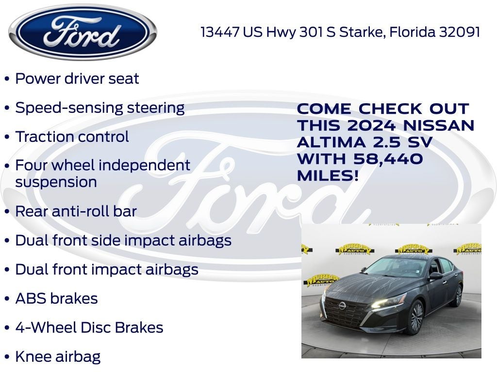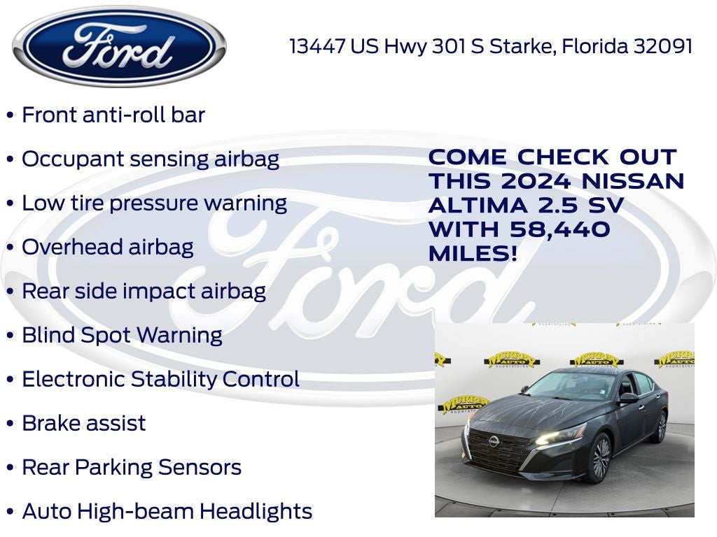 CARFAX One-Owner. Priced below KBB Fair Purchase Price! Murray Ford Superstore of Starke is very proud to offer this good-looking 2024 Nissan Altima in Super Black This vehicle is readily available and comes with the following CVT with Xtronic, 17 Alloy Wheels, 4-Wheel Disc Brakes, 6 Speakers, ABS brakes, Air Conditioning, Alloy wheels, AM/FM radio: SiriusXM, Auto High-beam Headlights, Blind Spot Warning, Brake assist, Bumpers: body-color, Cloth Seat Trim, Delay-off headlights, Driver door bin, Driver vanity mirror, Dual front impact airbags, Dual front side impact airbags, Electronic Stability Control, Four wheel independent suspension, Front anti-roll bar, Front Bucket Seats, Front Center Armrest, Front reading lights, Fully automatic headlights, Illuminated entry, Knee airbag, Low tire pressure warning, NissanConnect featuring Apple CarPlay, Occupant sensing airbag, Outside temperature display, Overhead airbag, Overhead console, Panic alarm, Passenger door bin, Passenger vanity mirror, Power door mirrors, Power driver seat, Power steering, Power windows, Radio data system, Radio: AM/FM Audio System, Rear anti-roll bar, Rear Parking Sensors, Rear reading lights, Rear seat center armrest, Rear side impact airbag, Rear window defroster, Remote keyless entry, Security system, Speed control, Speed-sensing steering, Speed-Sensitive Wipers, Split folding rear seat, Steering wheel mounted audio controls, Tachometer, Telescoping steering wheel, Tilt steering wheel, Traction control, Variably intermittent wipers, and Trip computer;