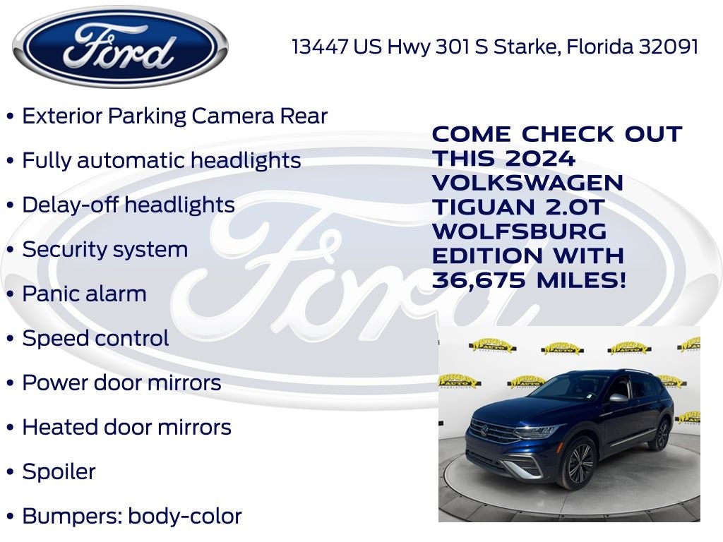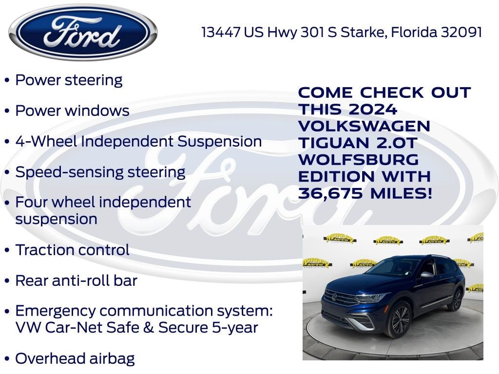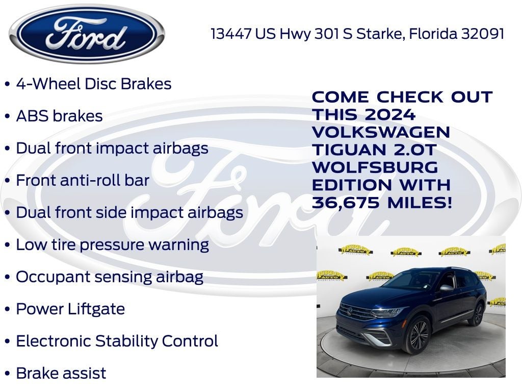 Recent Arrival! CARFAX One-Owner. Murray Ford Superstore of Starke is excited to offer this terrific 2024 Volkswagen Tiguan in Atlantic Blue Metallic This vehicle is readily available and comes with the following 3.33 Axle Ratio, 3rd row seats: bench, 4-Wheel Disc Brakes, 4-Wheel Independent Suspension, 6 Speakers, ABS brakes, Air Conditioning, Alloy wheels, AM/FM radio: SiriusXM with 360L, Auto-dimming Rear-View mirror, Brake assist, Bumpers: body-color, Compass, Delay-off headlights, Driver door bin, Driver vanity mirror, Dual front impact airbags, Dual front side impact airbags, Electronic Stability Control, Emergency communication system: VW Car-Net Safe & Secure 5-year, Exterior Parking Camera Rear, Four wheel independent suspension, Front anti-roll bar, Front Bucket Seats, Front Center Armrest, Front reading lights, Fully automatic headlights, Heated door mirrors, Heated Front Seats, Heated front seats, Illuminated entry, Leather Shift Knob, Low tire pressure warning, Occupant sensing airbag, Outside temperature display, Overhead airbag, Overhead console, Panic alarm, Passenger door bin, Passenger vanity mirror, Power door mirrors, Power driver seat, Power Liftgate, Power steering, Power windows, Radio data system, Radio: MIB3 Composition Media AM/FM/HD, Rain sensing wipers, Rear anti-roll bar, Rear reading lights, Rear seat center armrest, Rear window defroster, Rear window wiper, Remote keyless entry, Security system, Speed control, Speed-sensing steering, Split folding rear seat, Spoiler, Steering wheel mounted audio controls, Tachometer, Telescoping steering wheel, Tilt steering wheel, Traction control, Trip computer, Turn signal indicator mirrors, and Variably intermittent wipers;