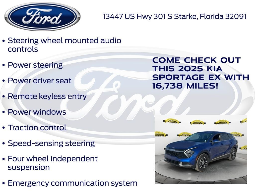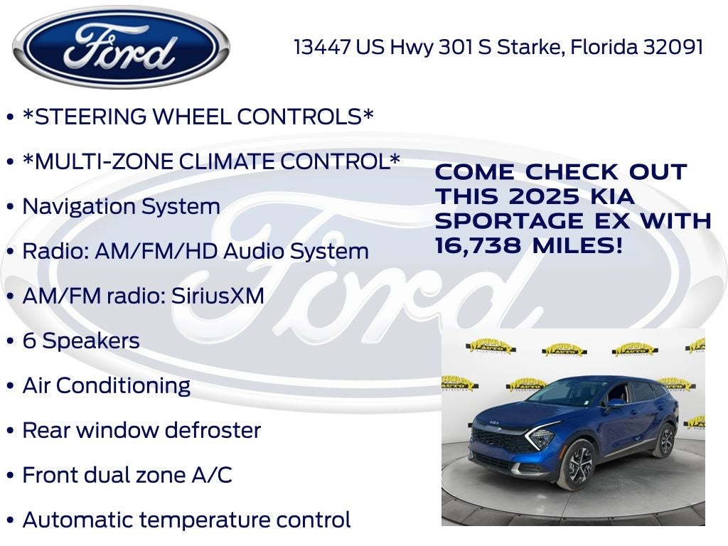 Recent Arrival! CARFAX One-Owner. Murray Ford Superstore of Starke is excited to offer this charming 2025 Kia Sportage in Sapphire Blue This vehicle is readily available and comes with the following 4-Wheel Disc Brakes, 6 Speakers, ABS brakes, Air Conditioning, Alloy wheels, AM/FM radio: SiriusXM, Apple CarPlay & Android Auto, Auto High-beam Headlights, Automatic temperature control, Brake assist, Bumpers: body-color, Carpeted Floor Mats, Compass, Delay-off headlights, Driver door bin, Driver vanity mirror, Dual front impact airbags, Dual front side impact airbags, Electronic Stability Control, Emergency communication system, Four wheel independent suspension, Front anti-roll bar, Front Bucket Seats, Front Center Armrest, Front dual zone A/C, Fully automatic headlights, Heated door mirrors, Heated Front Bucket Seats, Heated front seats, Illuminated entry, Leather Shift Knob, Leather steering wheel, Leatherette Seat Trim, Low tire pressure warning, Navigation System, Occupant sensing airbag, Outside temperature display, Overhead airbag, Overhead console, Panic alarm, Passenger door bin, Passenger vanity mirror, Power door mirrors, Power driver seat, Power steering, Power windows, Radio: AM/FM/HD Audio System, Rain sensing wipers, Rear anti-roll bar, Rear seat center armrest, Rear side impact airbag, Rear window defroster, Rear window wiper, Remote keyless entry, Security system, Speed control, Speed-sensing steering, Split folding rear seat, Spoiler, Steering wheel mounted audio controls, Tachometer, Telescoping steering wheel, Tilt steering wheel, Traction control, Trip computer, Turn signal indicator mirrors, Variably intermittent wipers, and Wheels: 18 x 7.5J Machined Alloy;